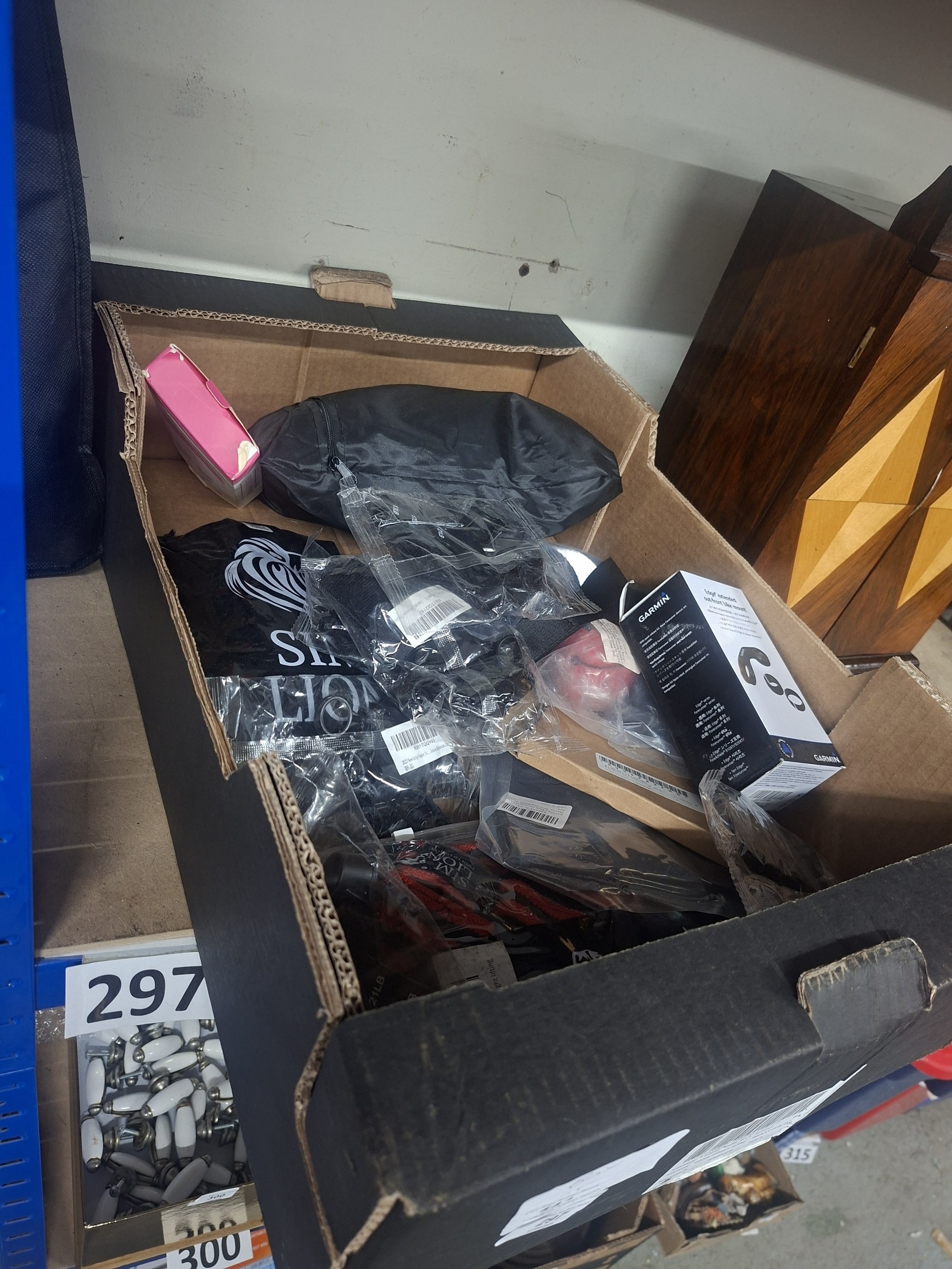 A used cardboard box contains bike accessories, including a Garmin Edge mount, straps, and other items.