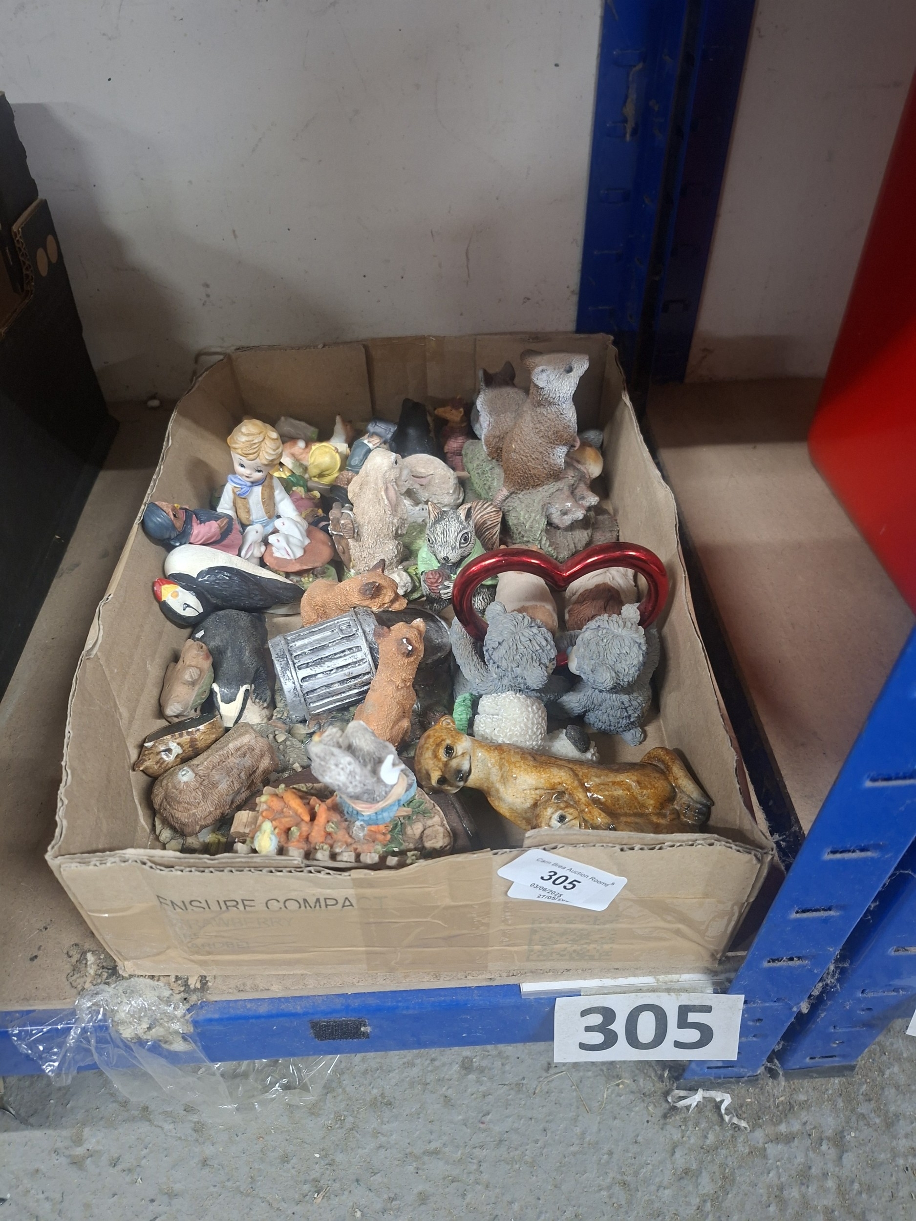 Box of assorted resin animal and child figurines, showing minor wear.