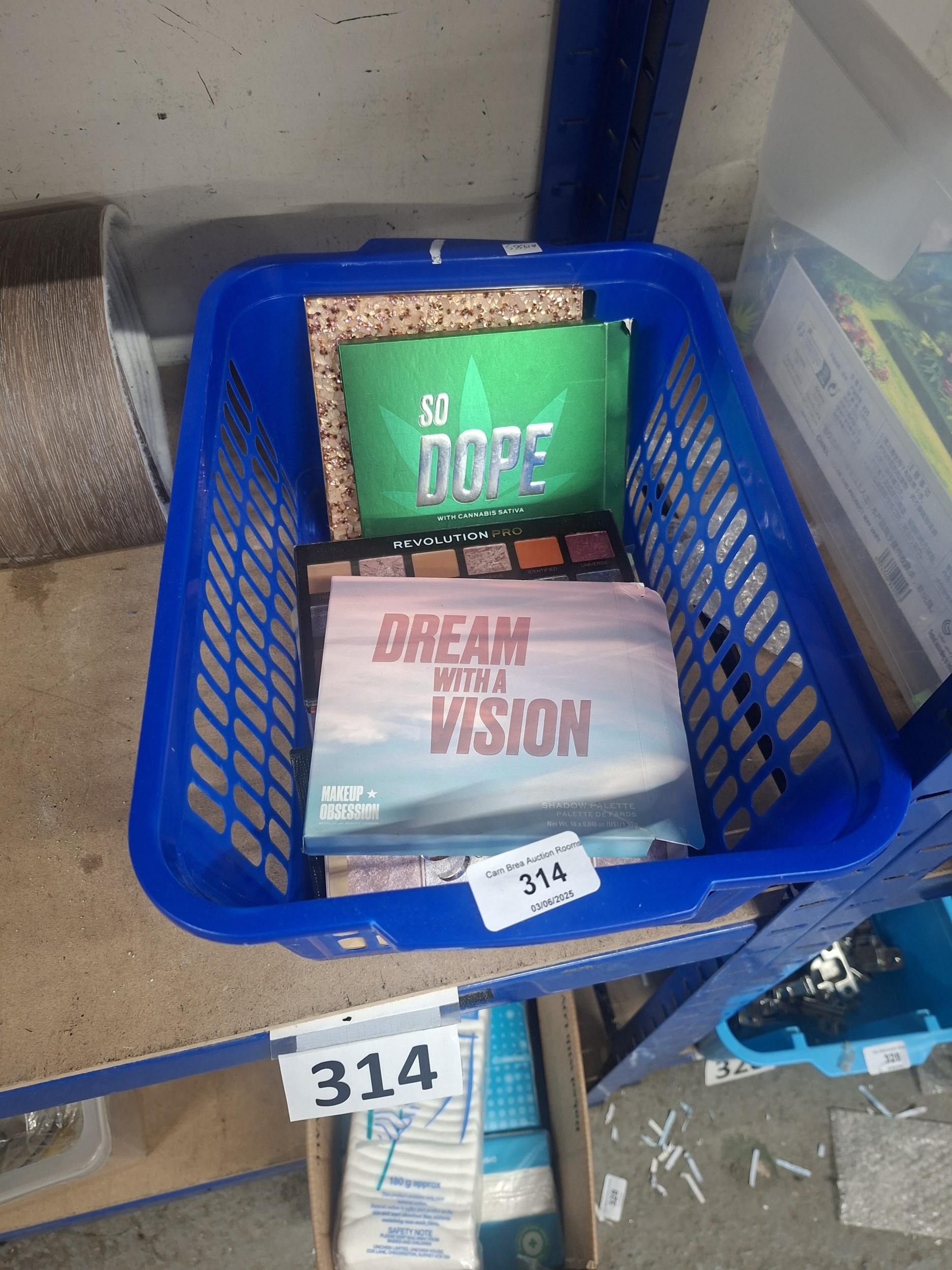 Lot contains three makeup palettes (SO DOPE, DREAM WITH A VISION, and one partially visible) in a slightly scuffed blue plastic basket.