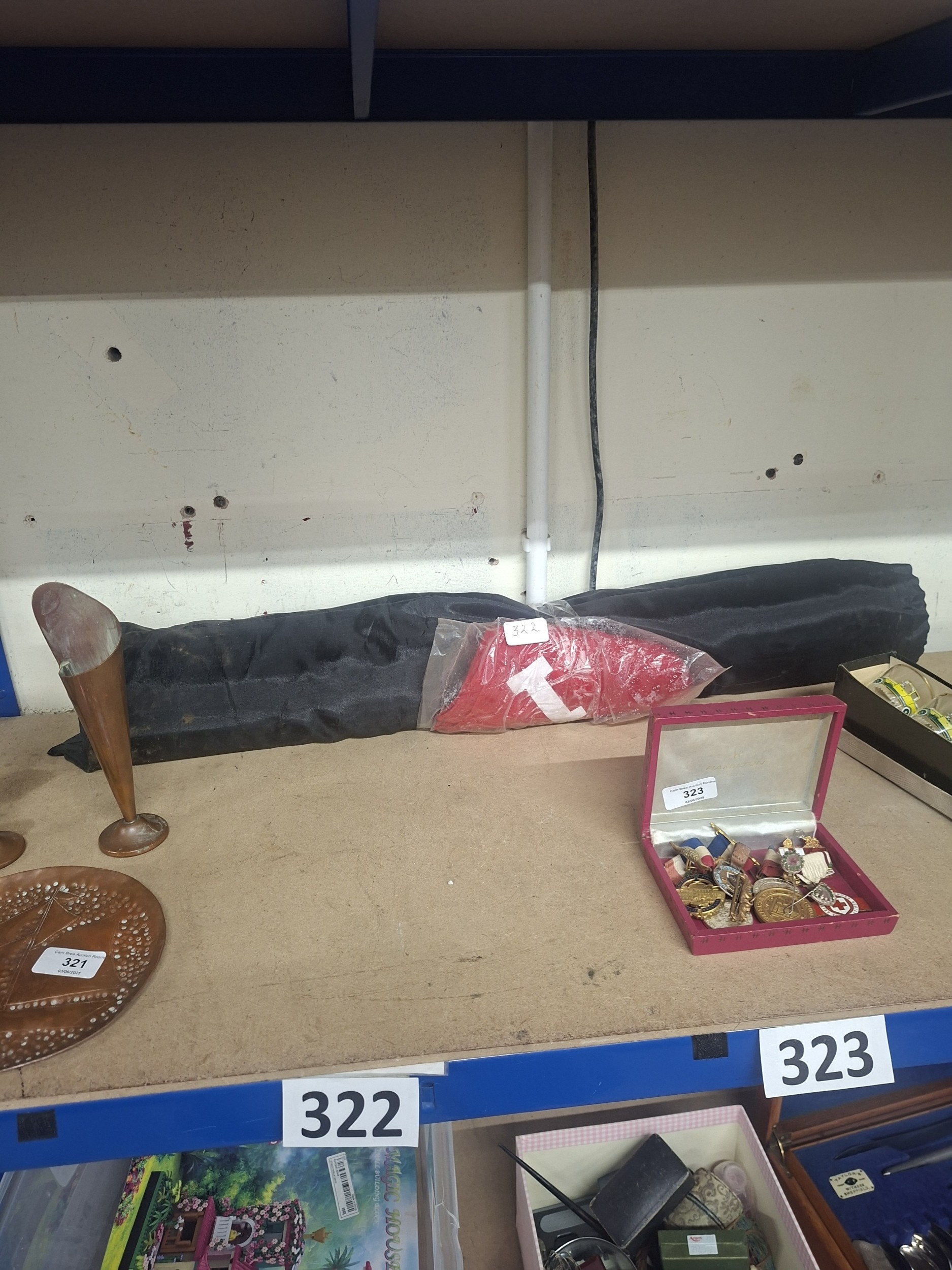 A black cylindrical fabric item, possibly an umbrella, is in a clear plastic bag with a partially visible red item marked “1”.