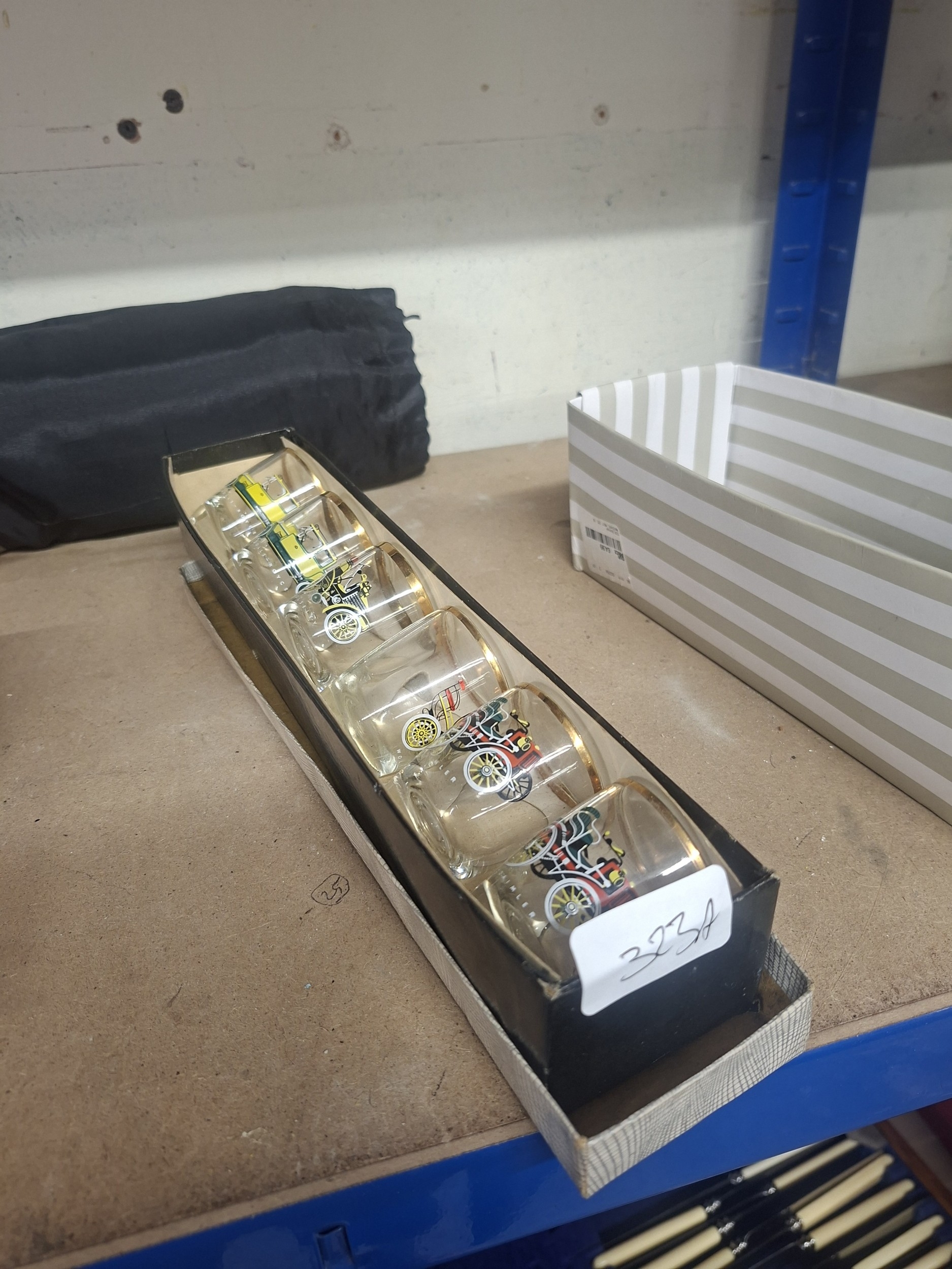 Set of six small shot glasses with gold rims and vintage car images, in a slightly worn box.