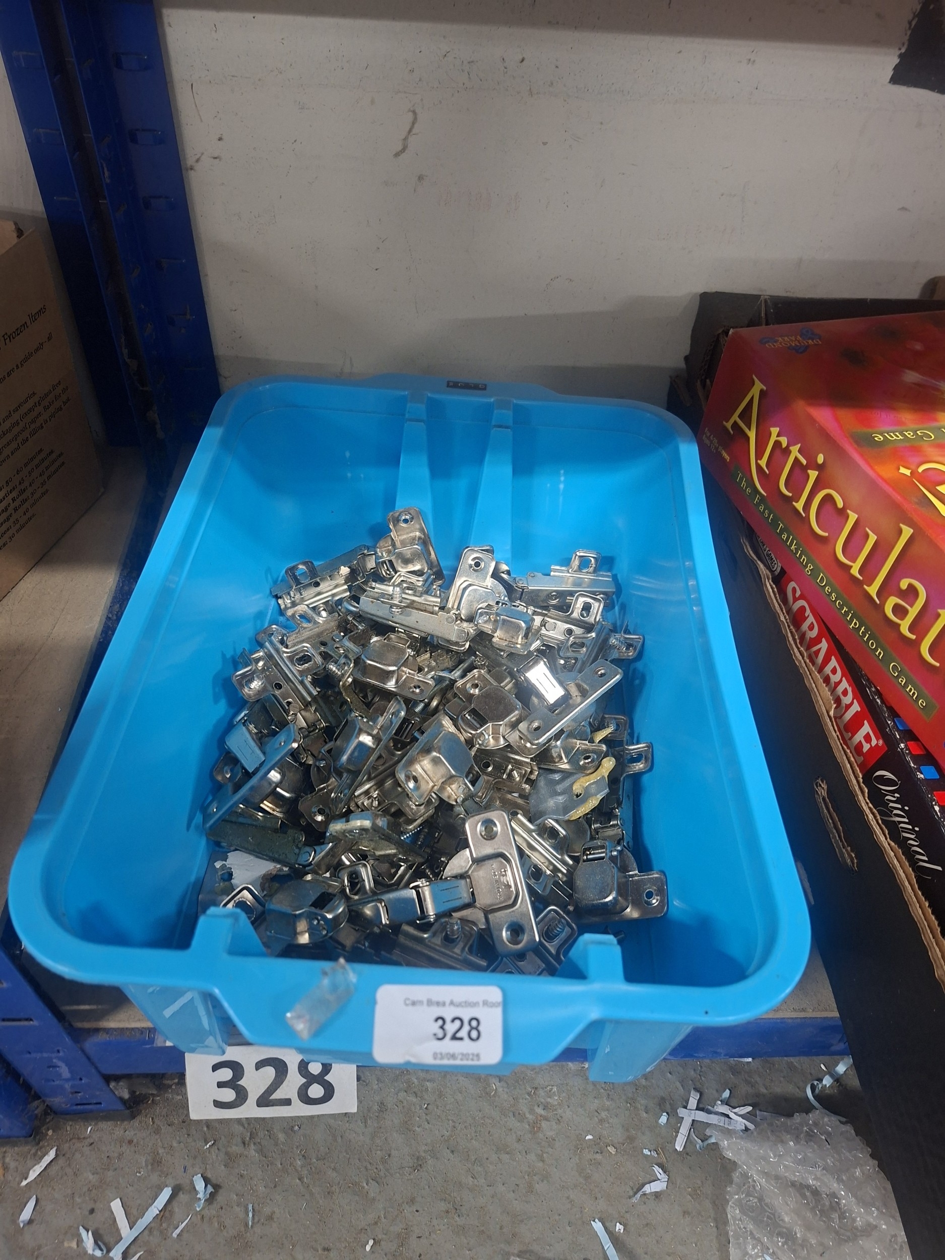 A tray of silver-toned metal cabinet hinges shows minor wear.
