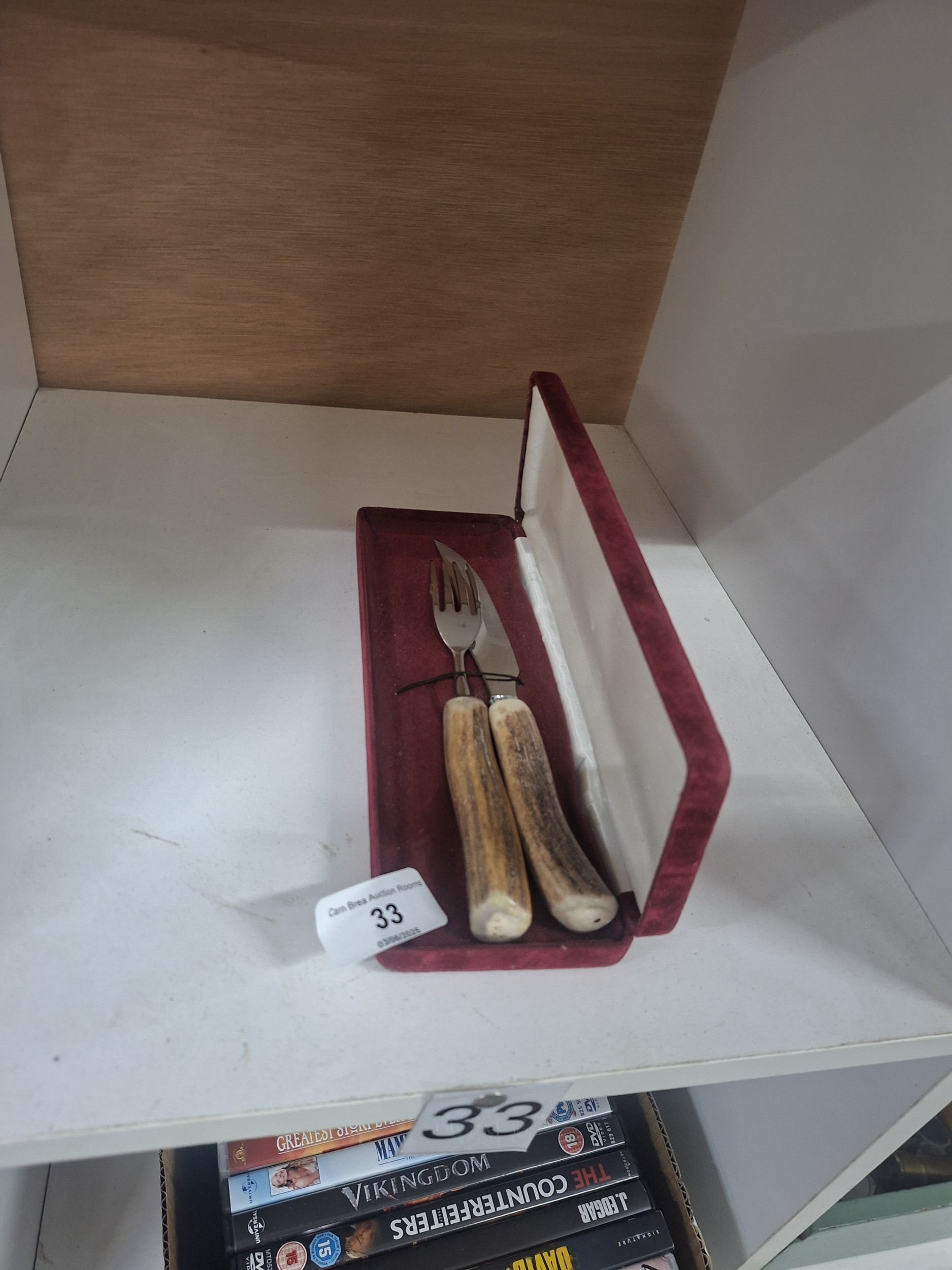 A silver-bladed knife and fork with light brown stag horn handles are presented in a burgundy velvet-lined case.