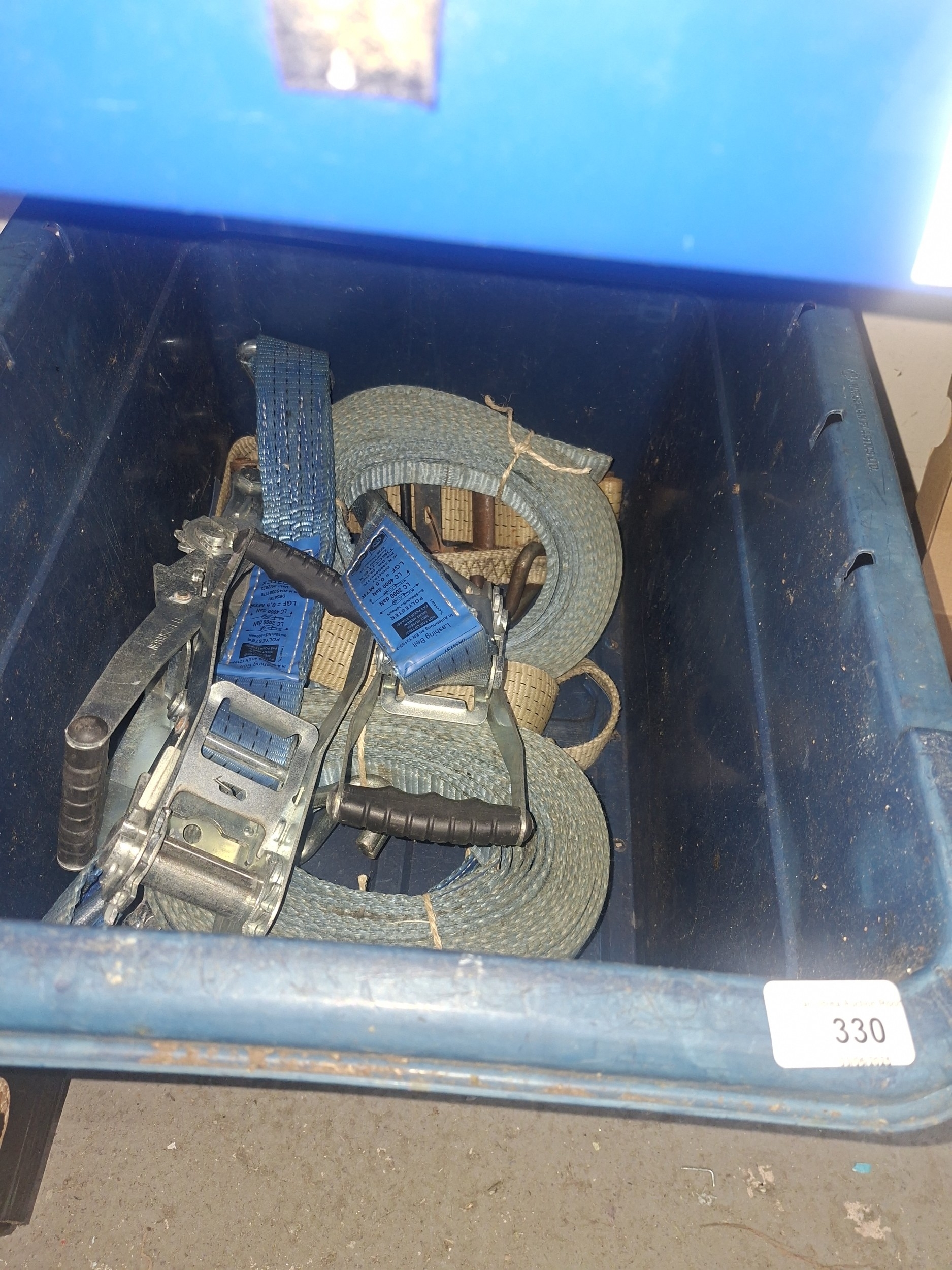Lot 330 includes two used ratchet straps in a plastic bin, showing minor wear.