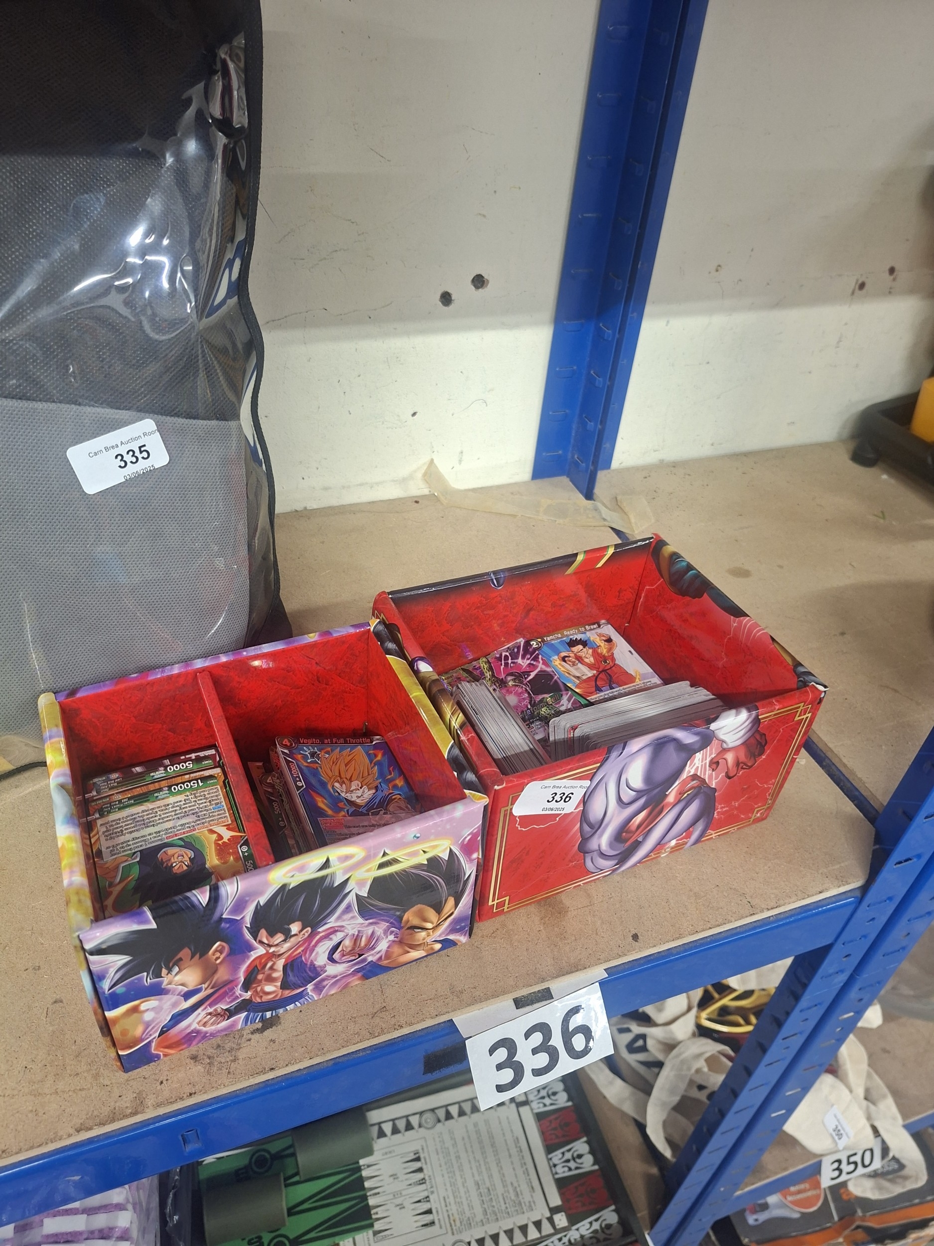 Two cardboard boxes contain numerous anime trading cards, showing minor wear.