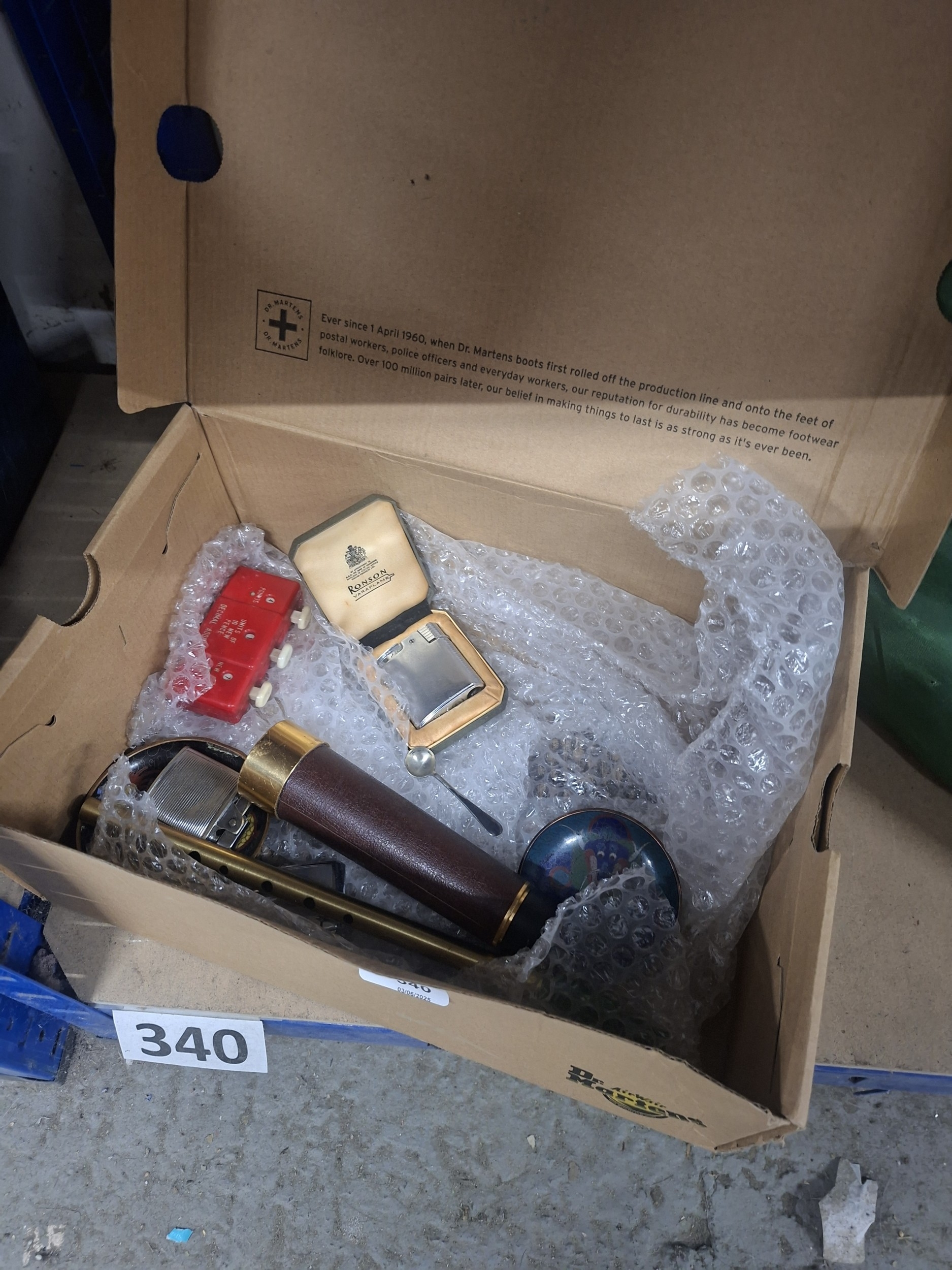 A Dr. Martens box contains a vintage lighter, a red rectangular object, a cylindrical object, a small dish, and a spoon.