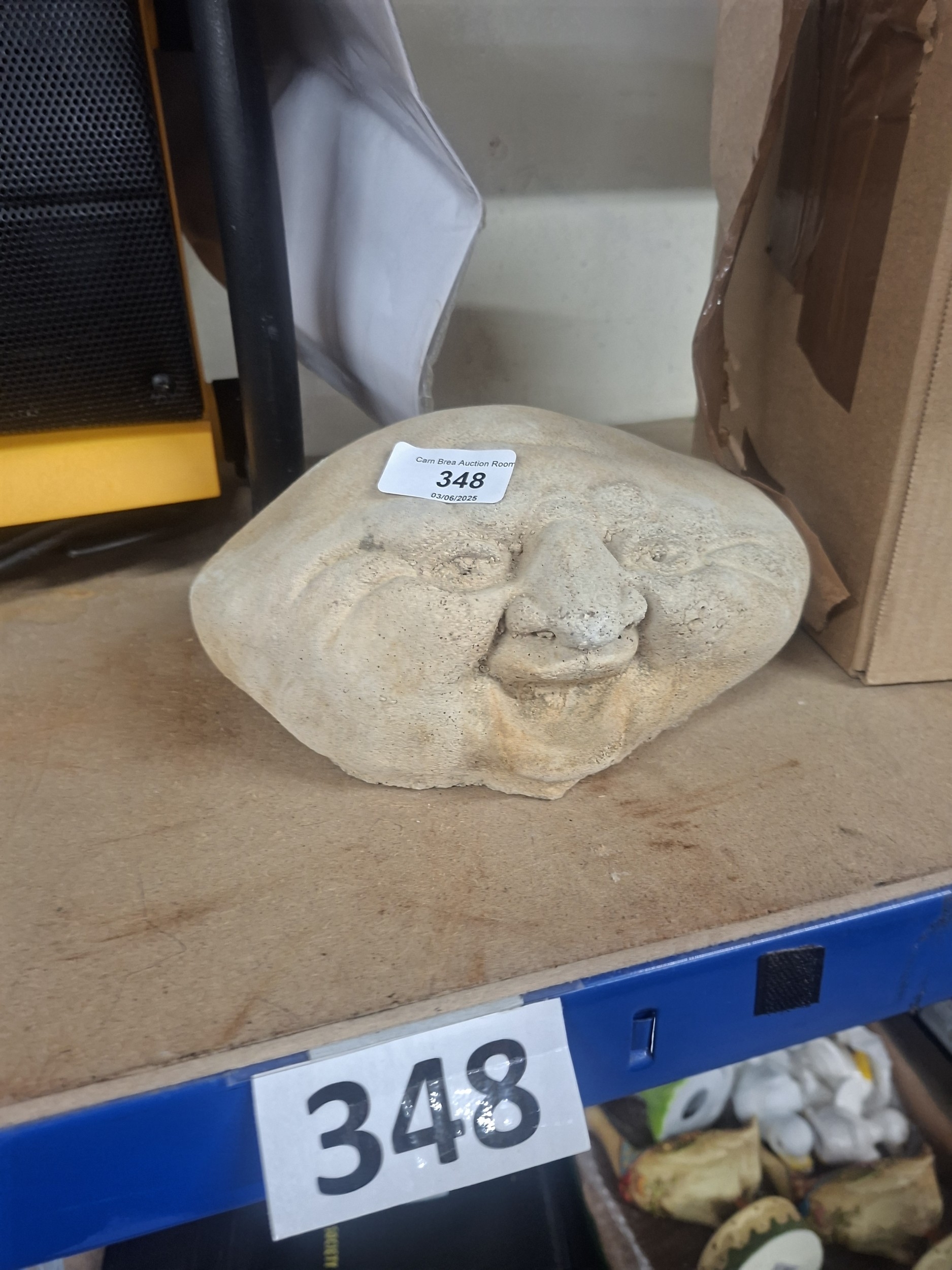 A roughly sculpted, light beige stone face with a slightly asymmetrical design and textured surface.