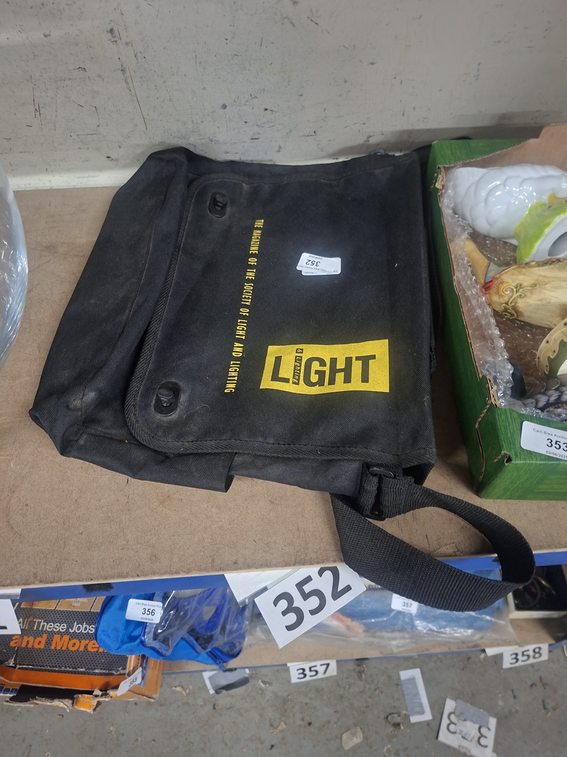 Black canvas messenger bag with yellow “LIGHT” logo, showing minor wear.