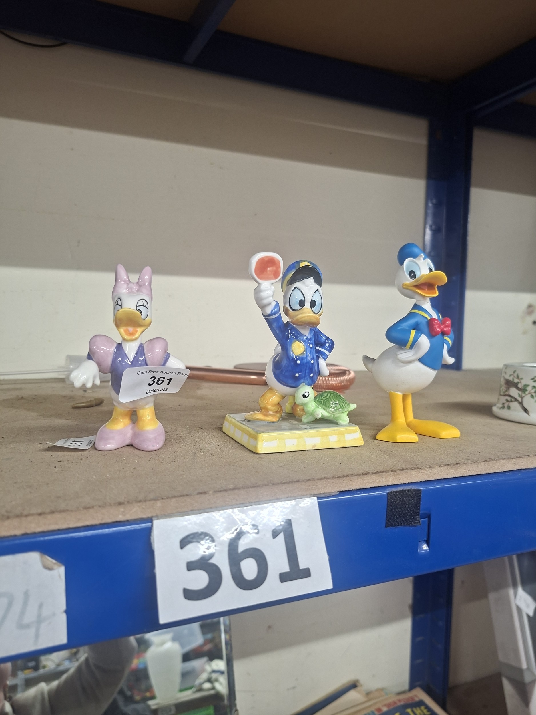 Set of three ceramic Disney figurines: Daisy Duck, Donald Duck (police), and Donald Duck (sailor), with minor paint inconsistencies.
