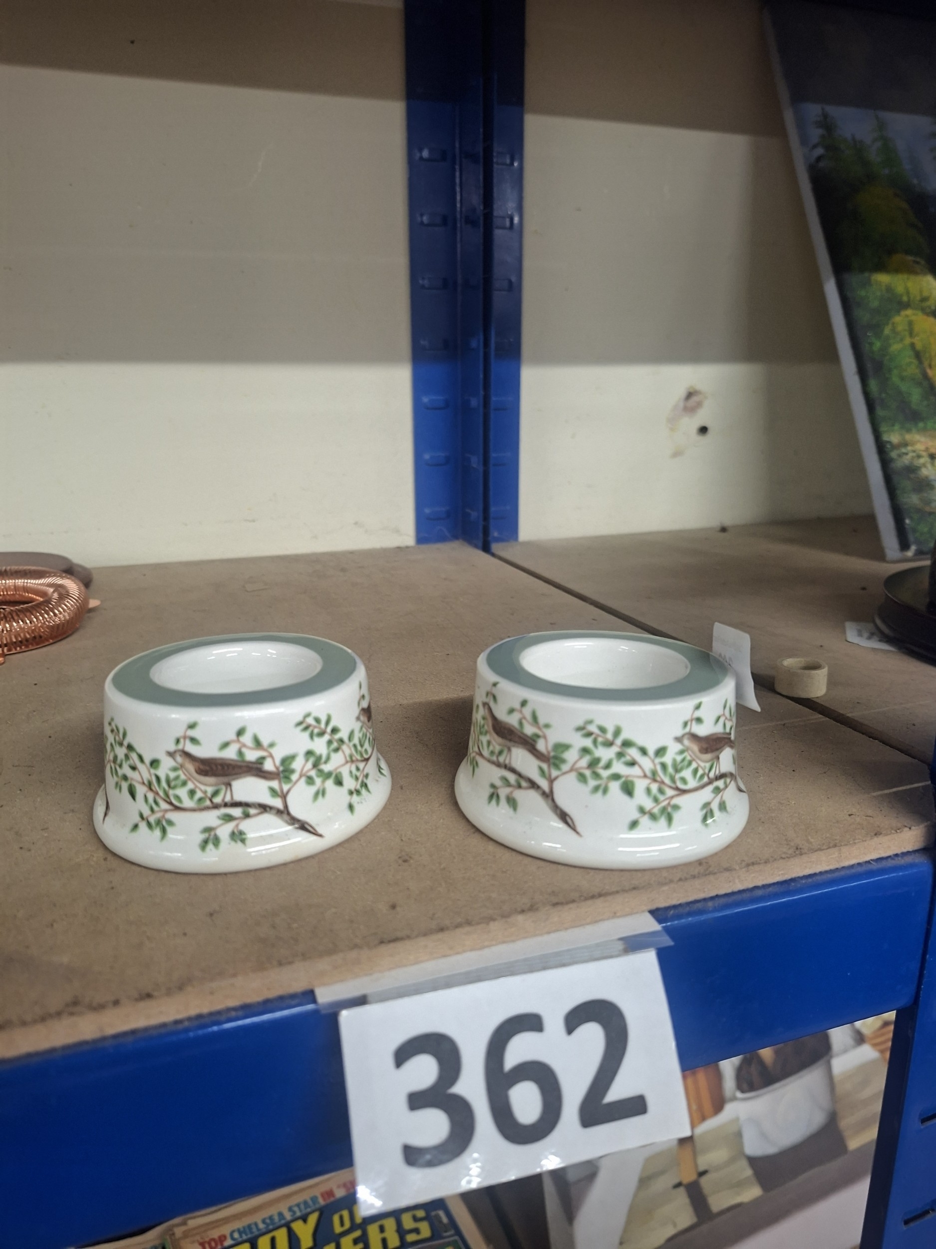 Two white ceramic egg cups with teal banding and brown bird designs.