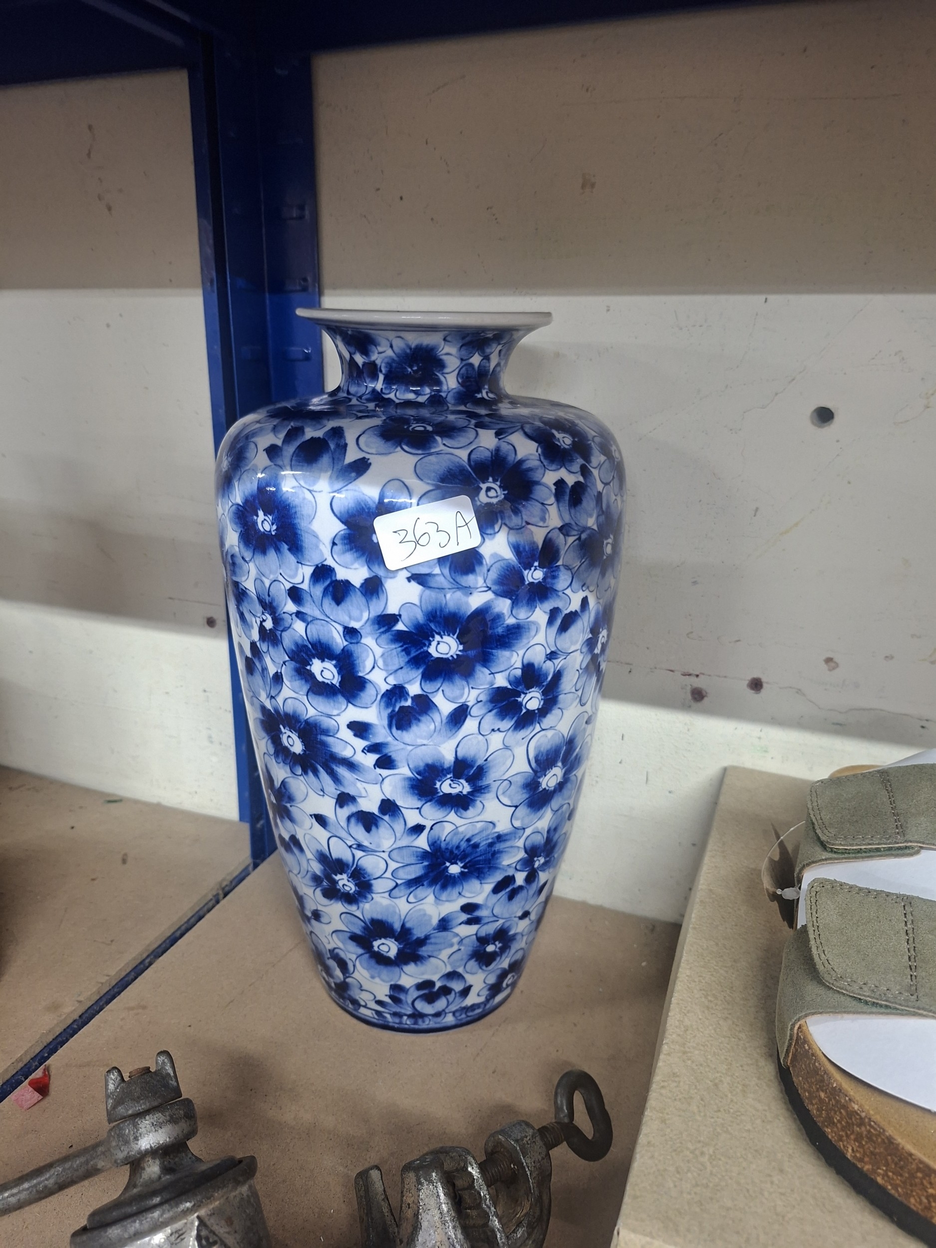 A matte white ceramic vase with a bulbous body and blue floral pattern.