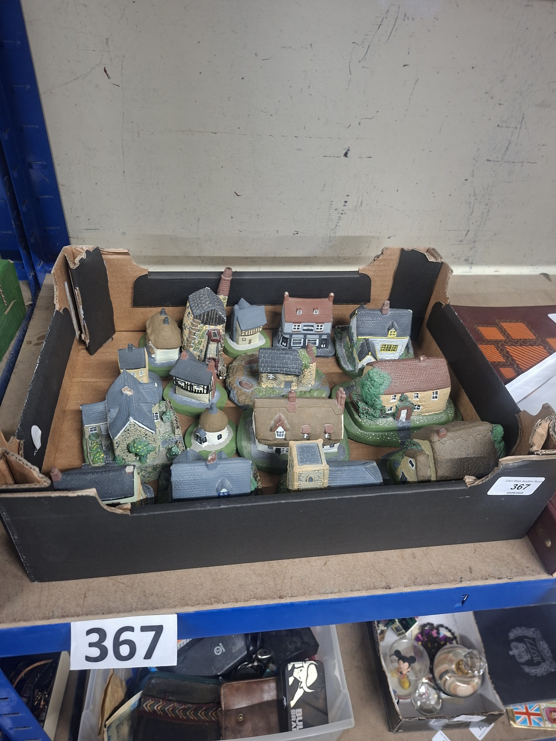 Box of fifteen miniature ceramic/resin houses and buildings, showing minor wear.