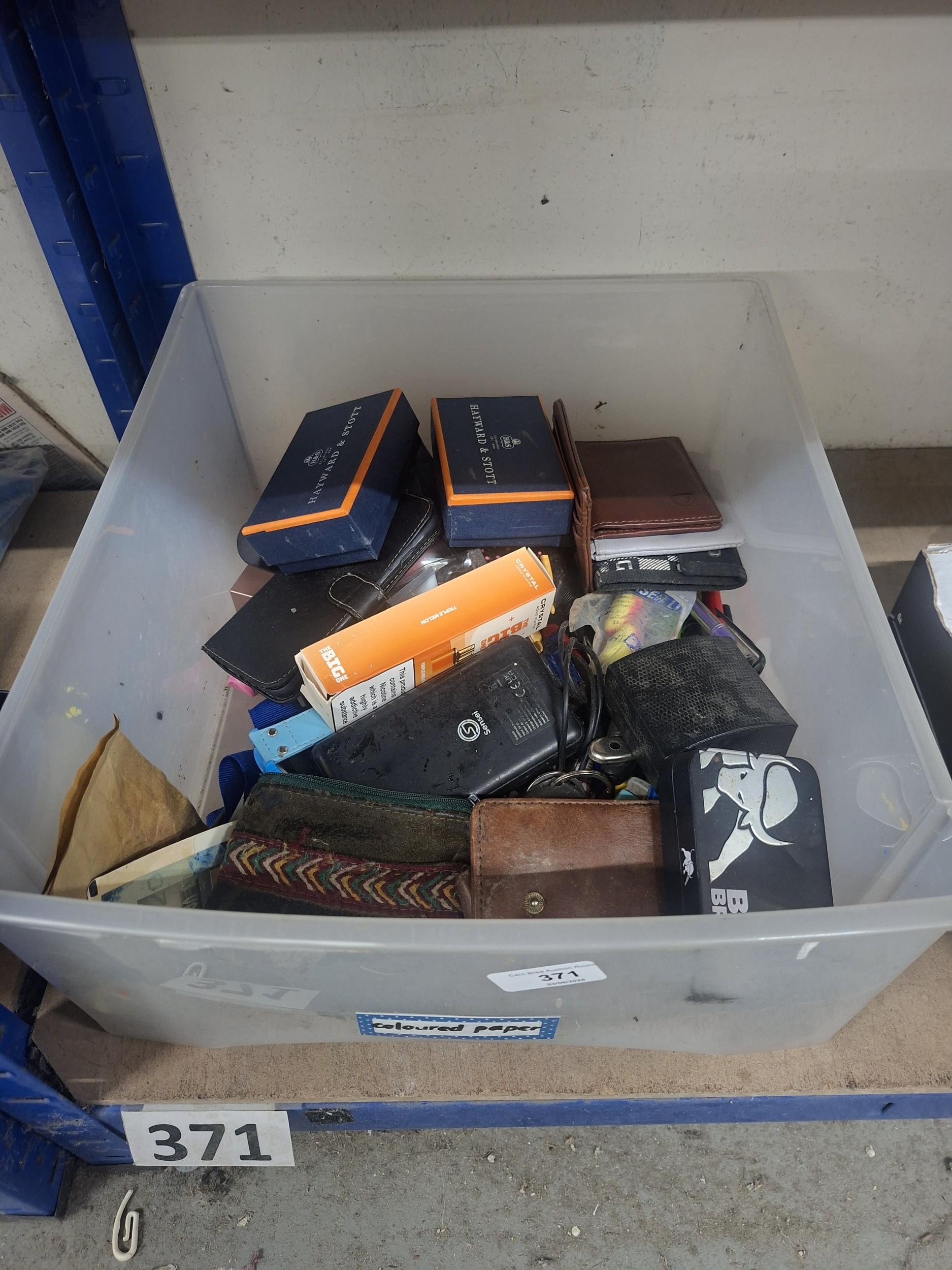 A plastic bin containing used leather wallets, branded boxes, electronics, and miscellaneous items.
