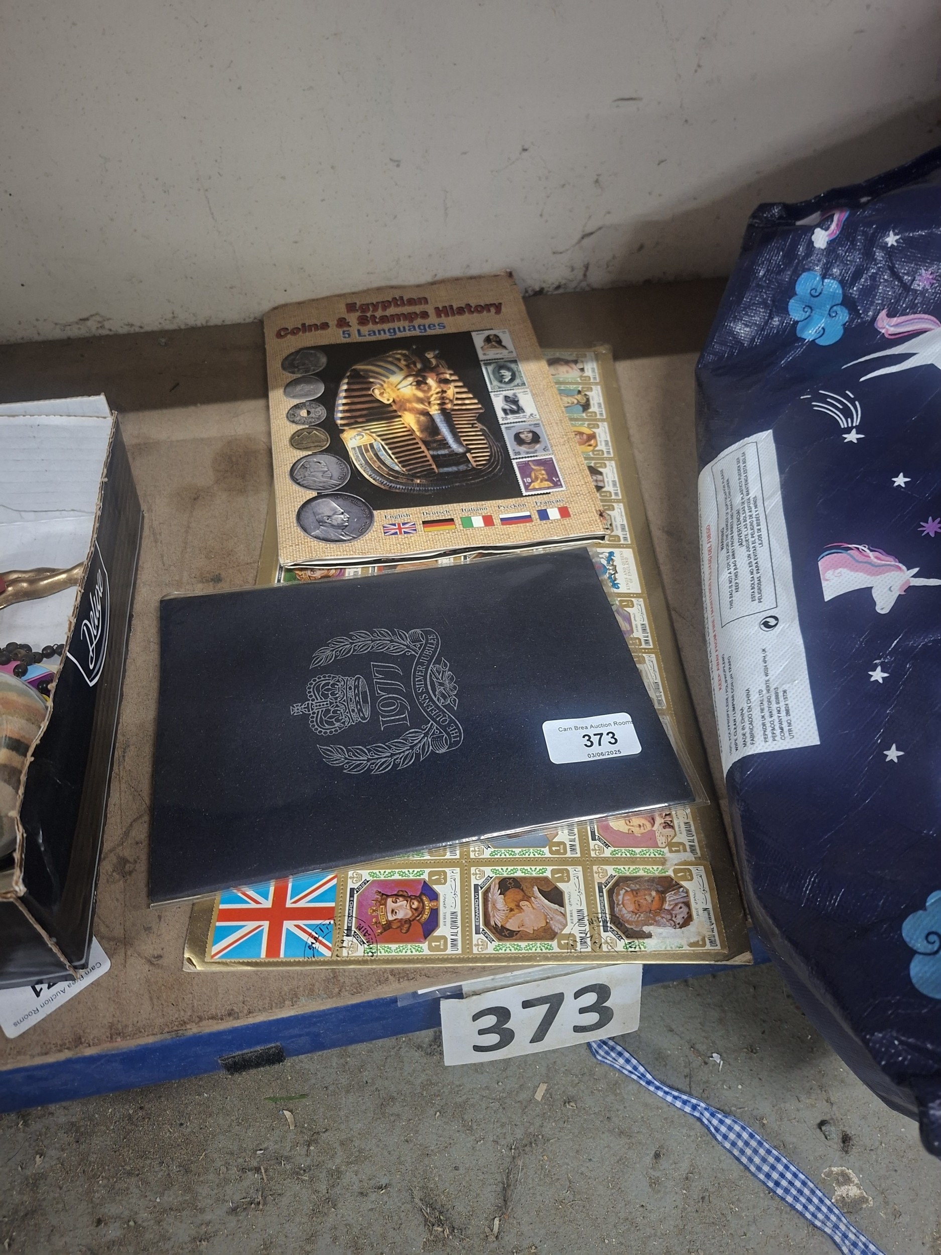 Lot includes a black album with embossed details, a book on Egyptian coins and stamps, and various stamp sheets.