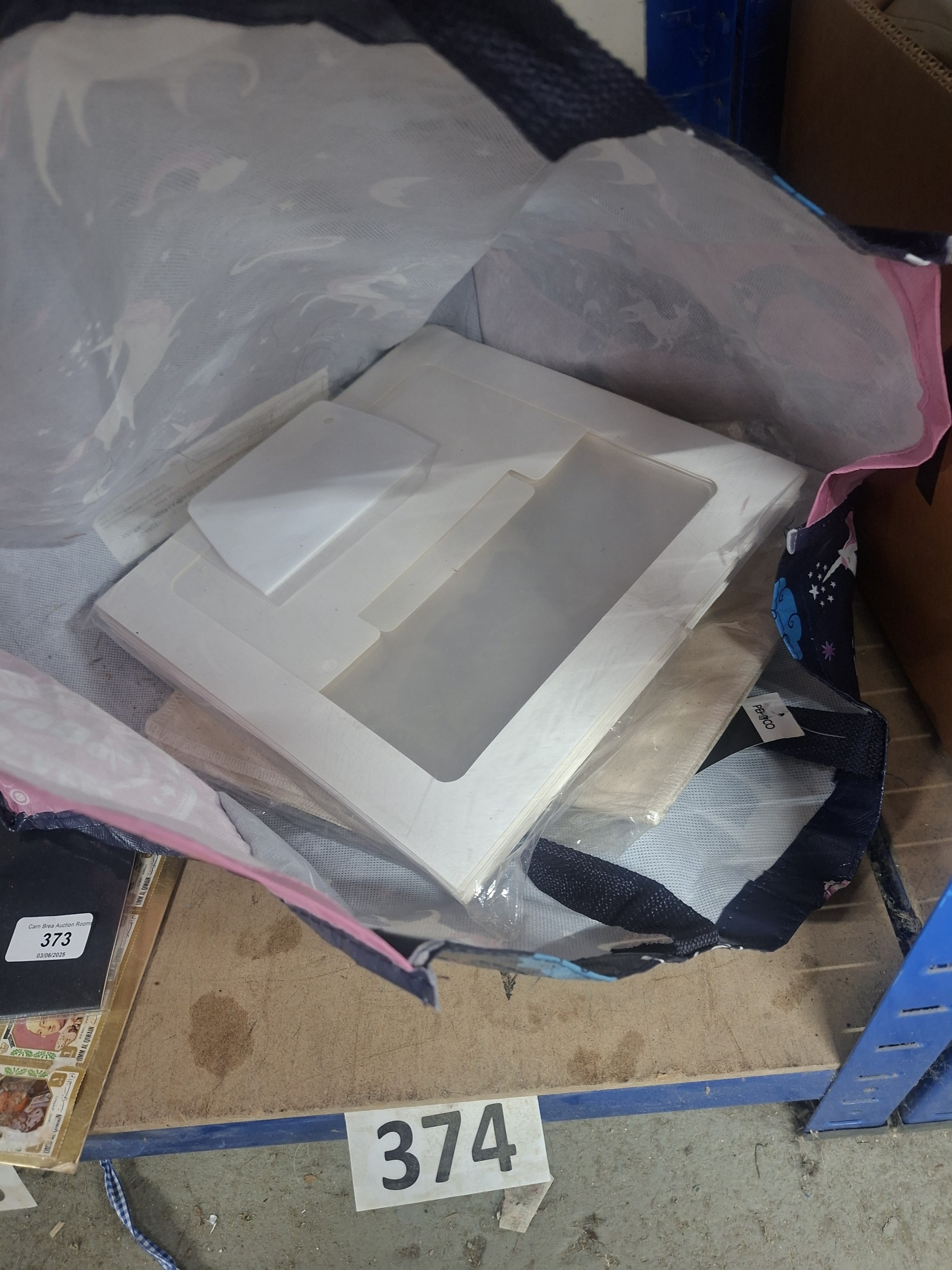 A stack of white cardboard picture frame inserts and a beige fabric scrap are in a clear plastic bag inside a PEPOCO tote bag.
