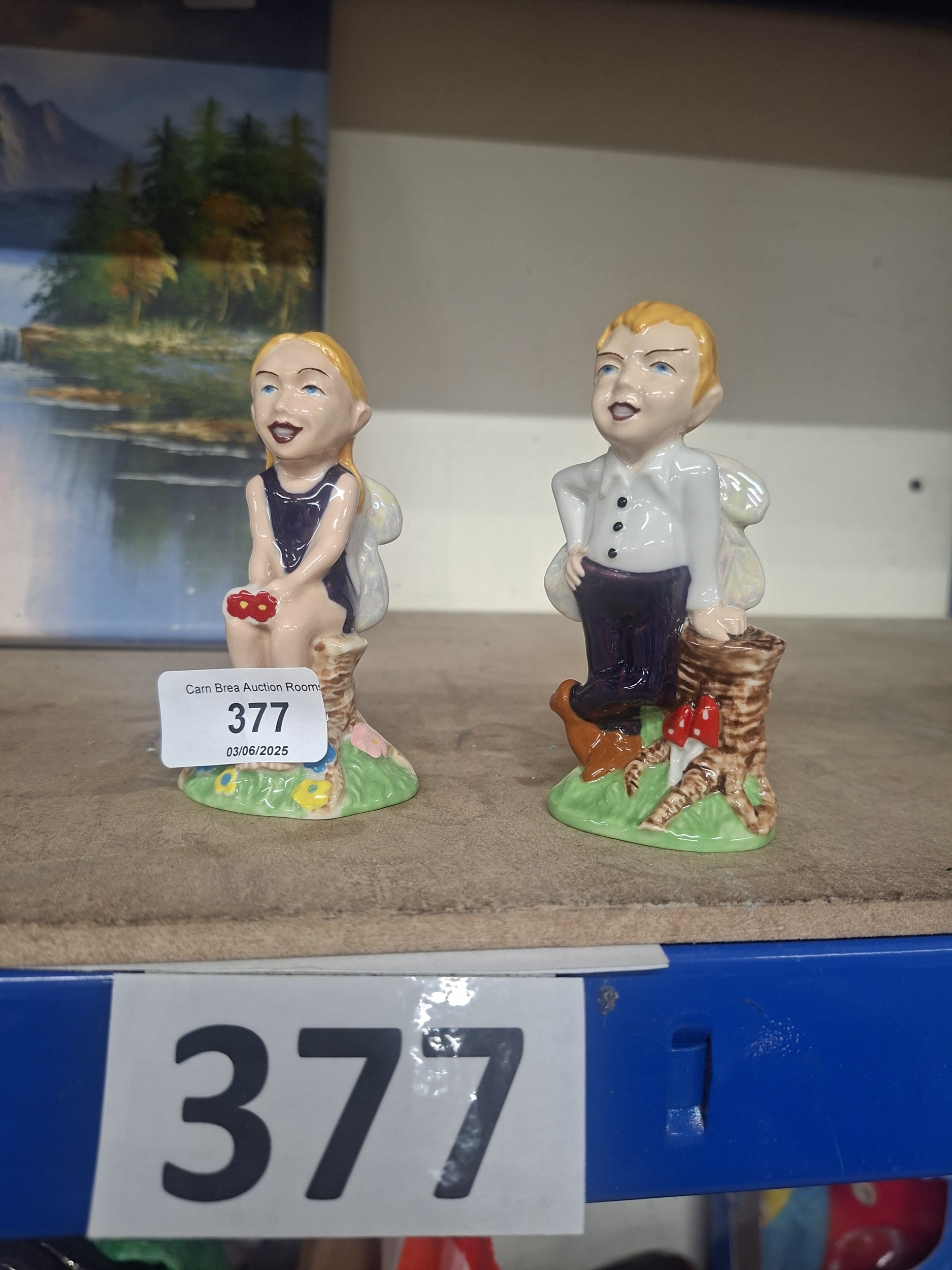 Two ceramic fairy figurines, one seated female, one standing male, on a mushroom and tree stump base.