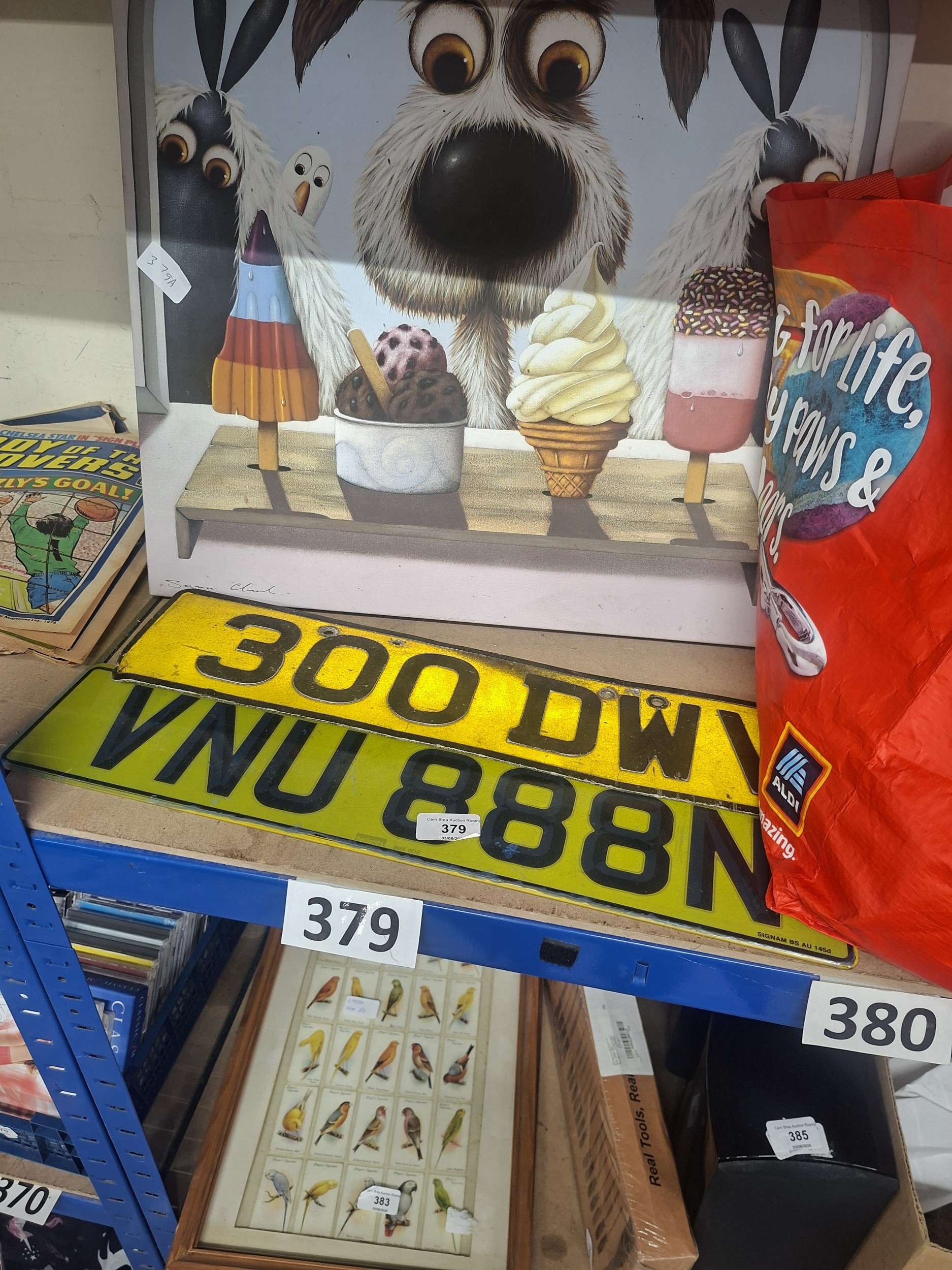 A framed children’s illustration of animals with ice cream, alongside a license plate, bag, and another framed print.