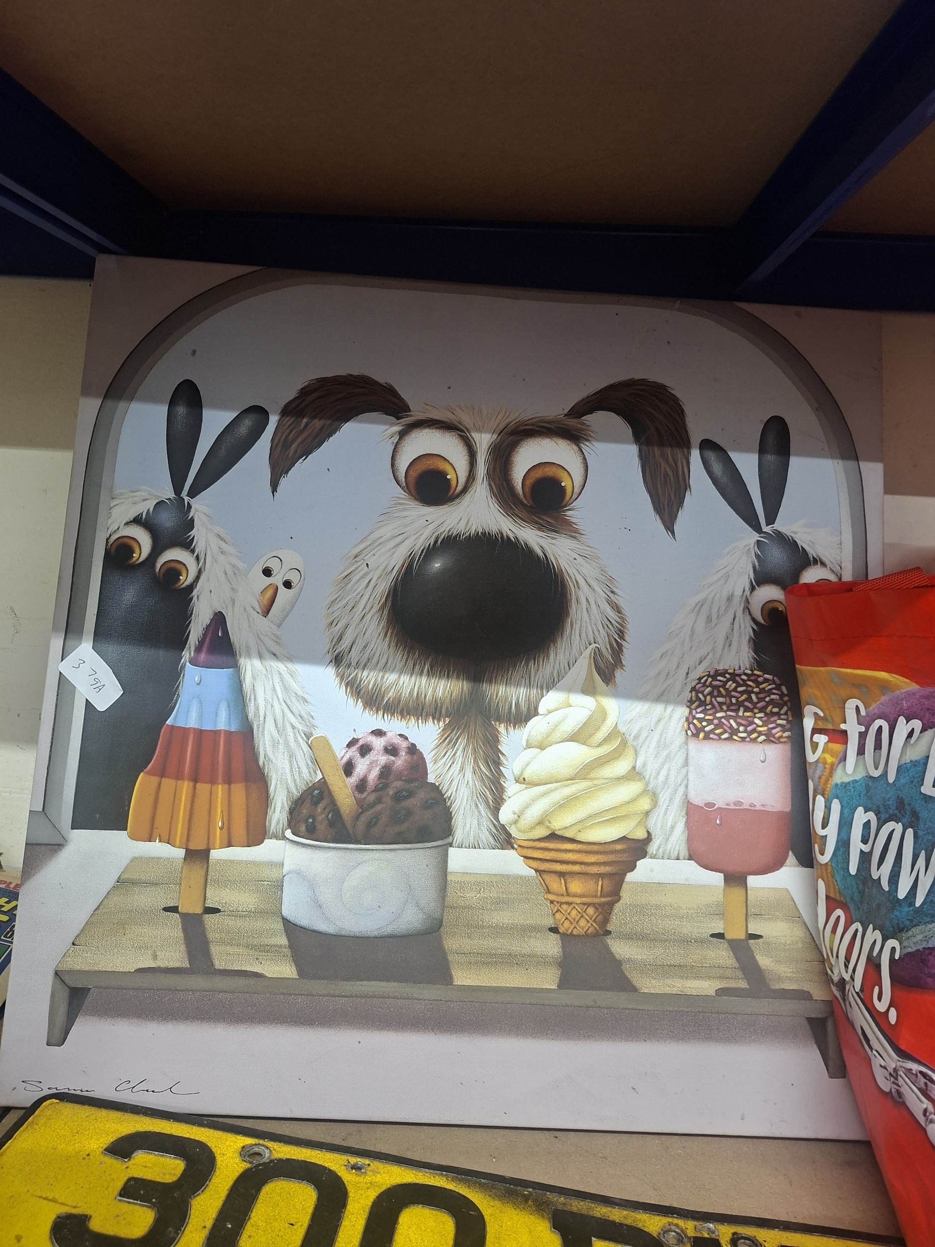 Rectangular canvas print depicting a cartoon dog and two sheep enjoying ice cream, signed “Sarah Clark”.
