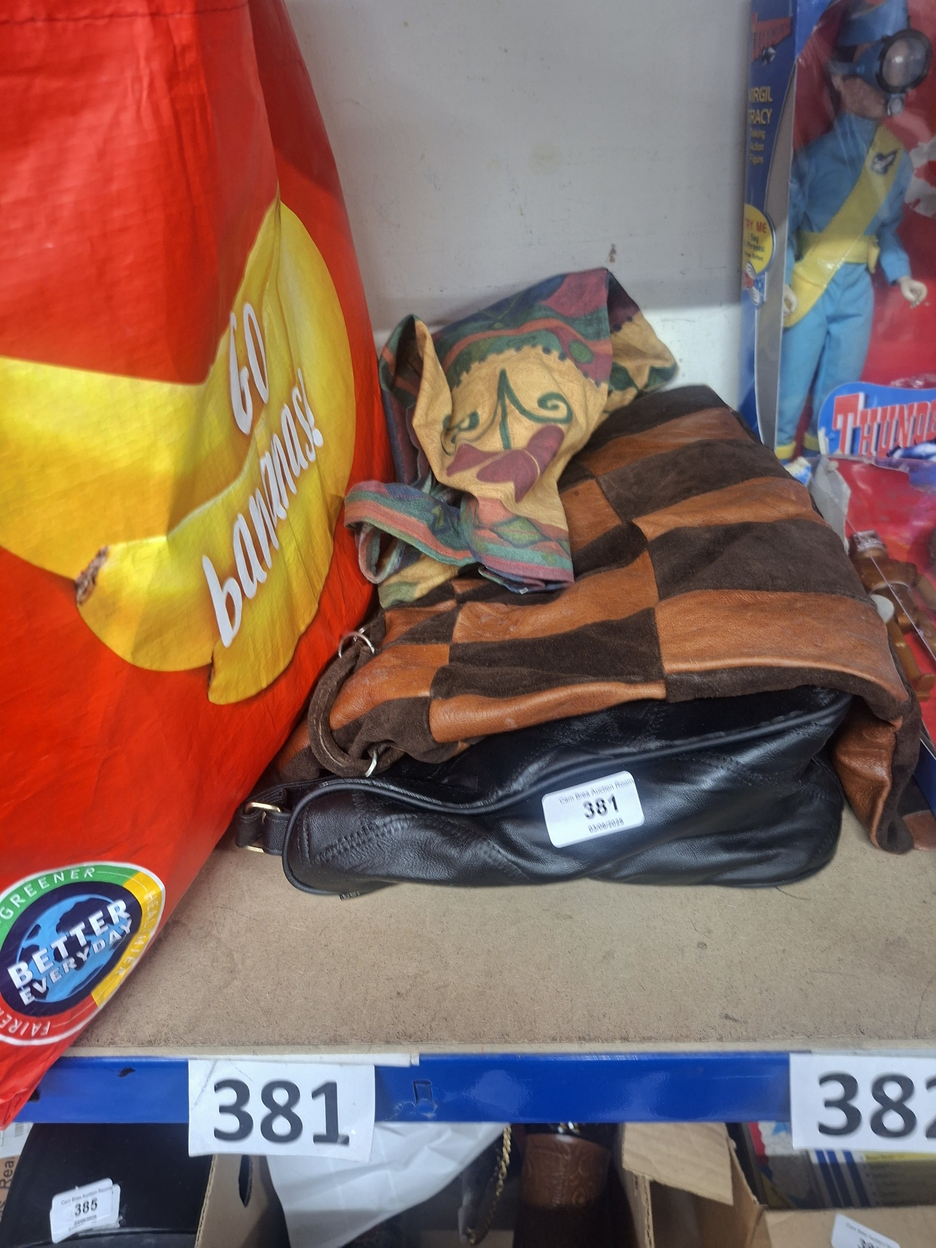 Lot includes a black leather bag and a patchwork brown leather/suede bag, plus a red fabric bag.