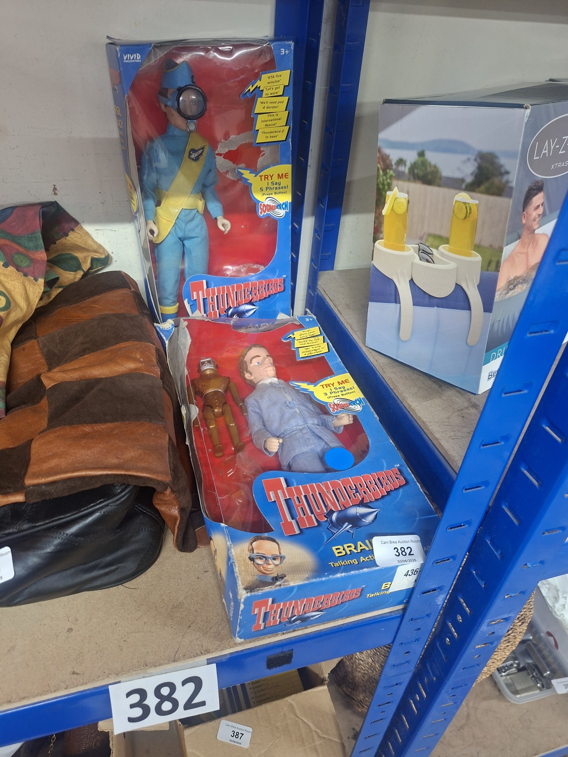 Two Thunderbirds-themed toy boxes, one larger and one smaller, containing figures and featuring sound functions.