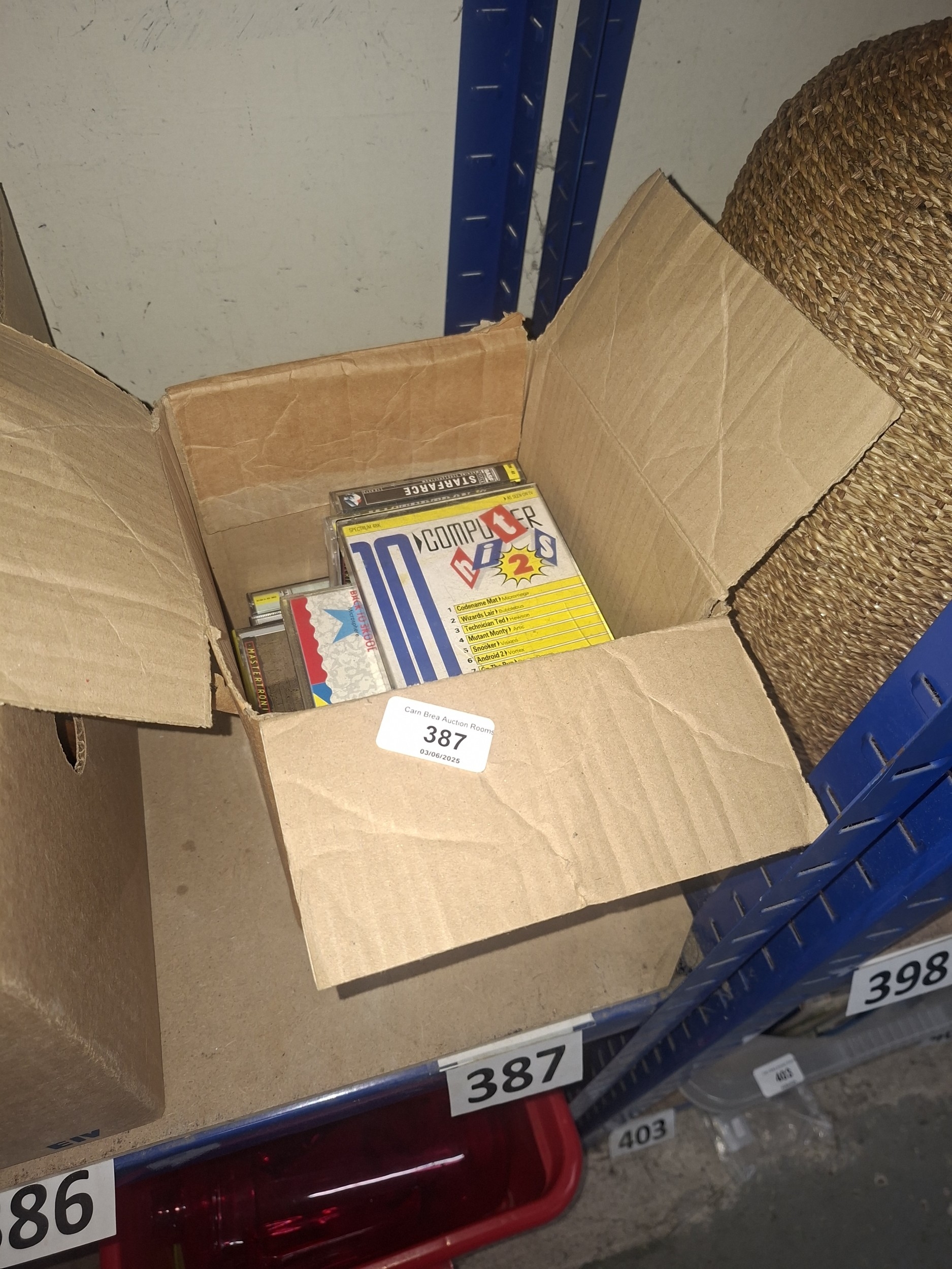 A box of used cassette tapes, mostly games for the Spectrum 48K, showing some wear.