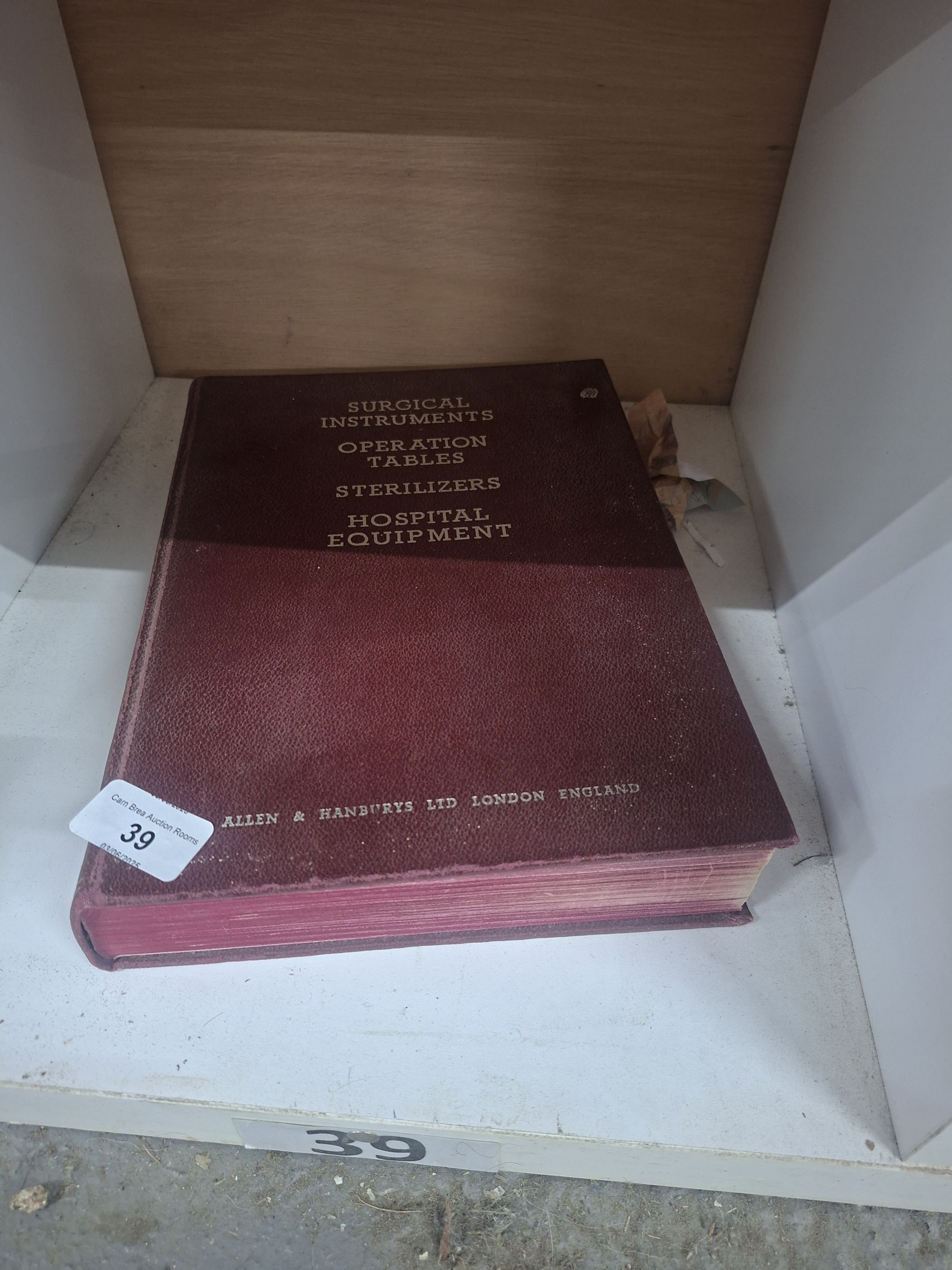 A maroon, textured-cover book listing surgical instruments, operation tables, sterilizers, and hospital equipment.