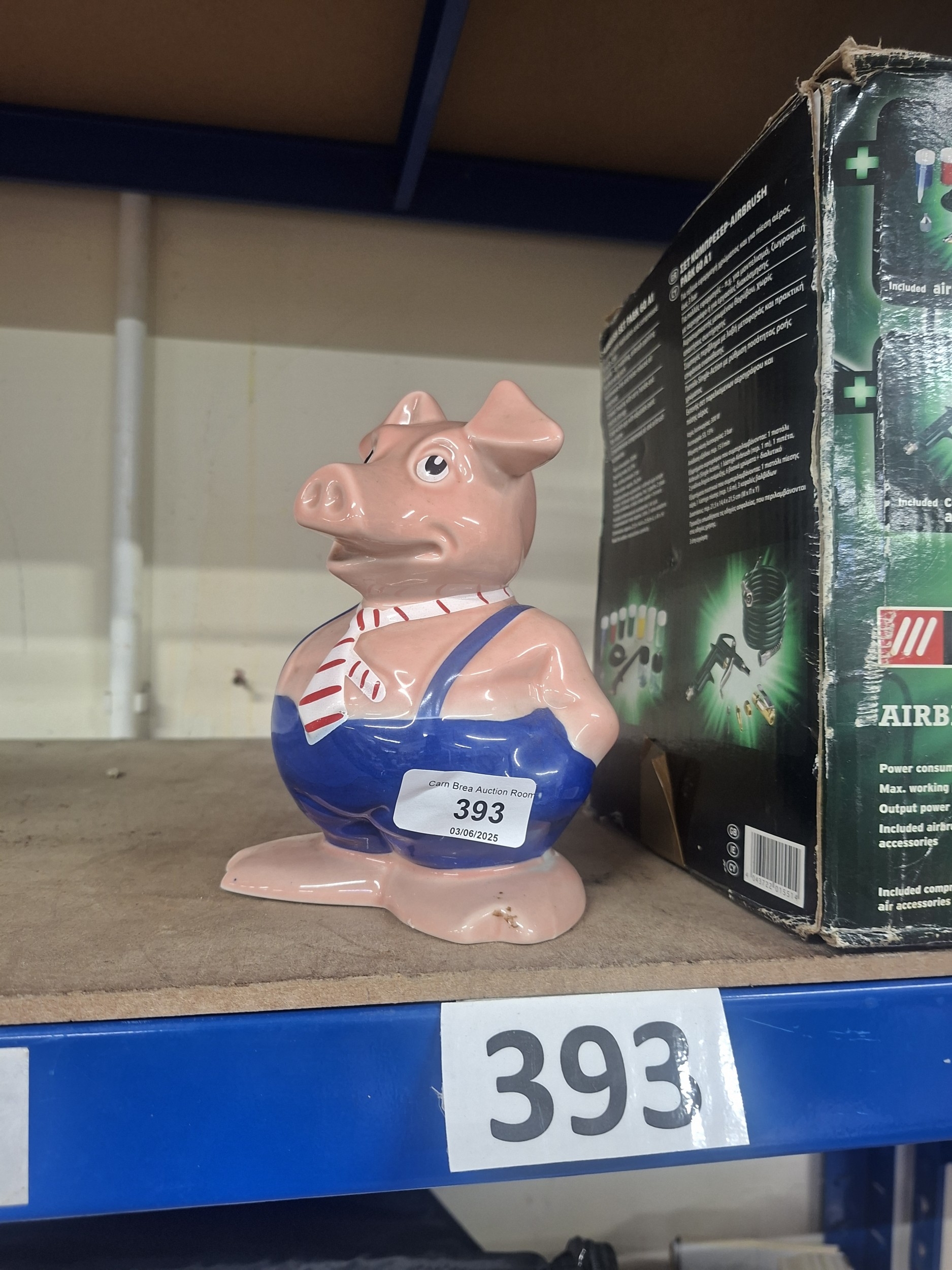 A small, light pink ceramic piggy bank wearing blue overalls and a striped tie, with minor damage.