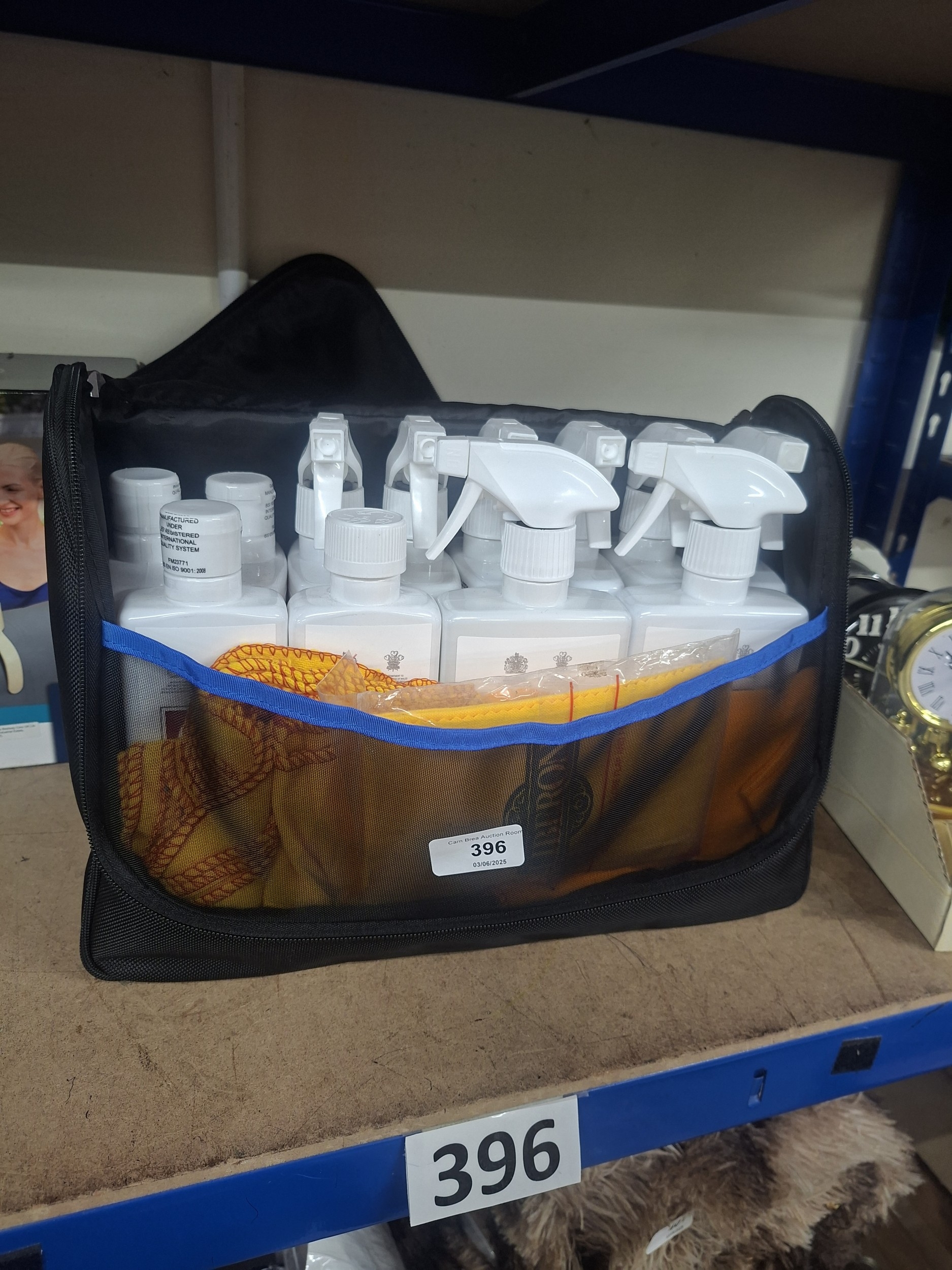 A black zippered case contains eight spray bottles with clear liquid, two cloths, and labels indicating manufacturing details.