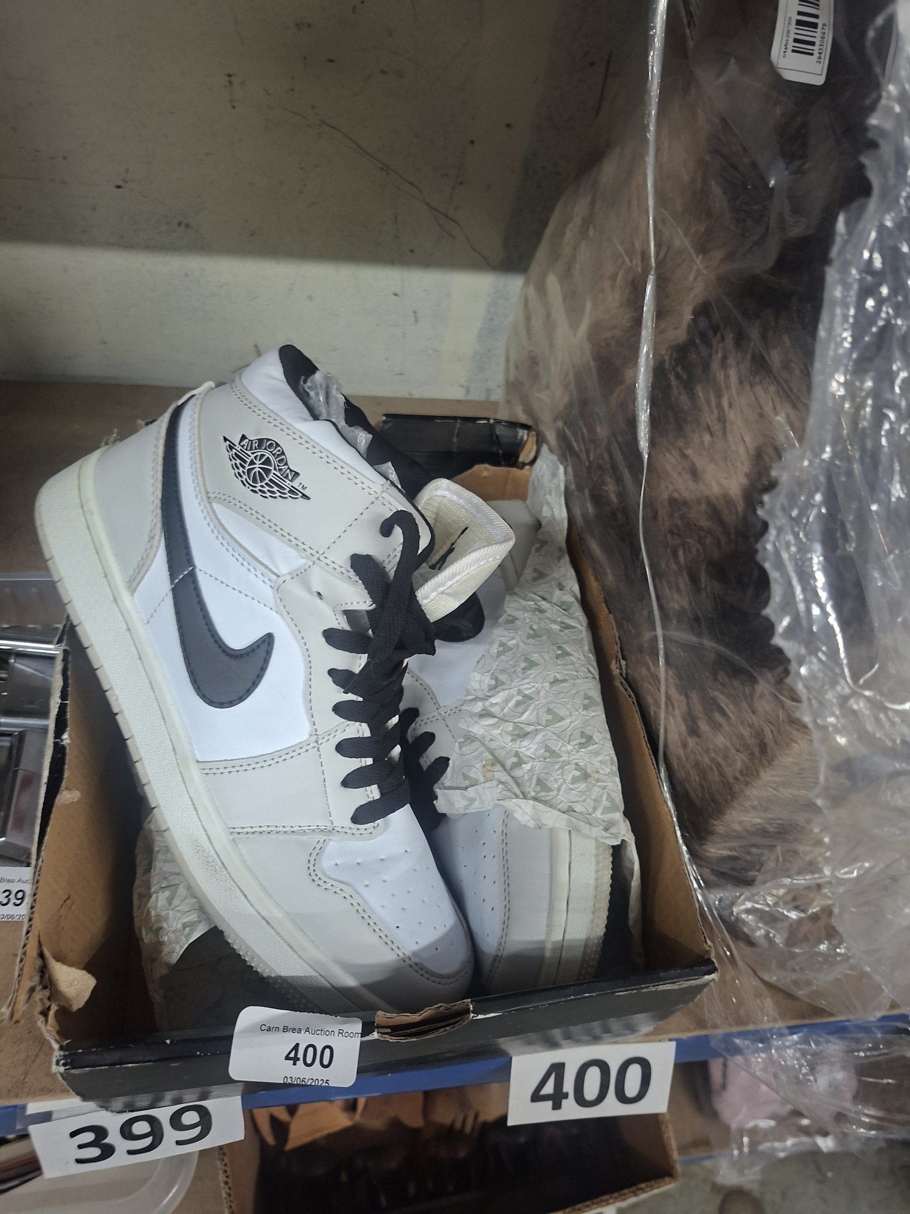 New or gently used pair of gray and black Air Jordan mid-top sneakers in box.
