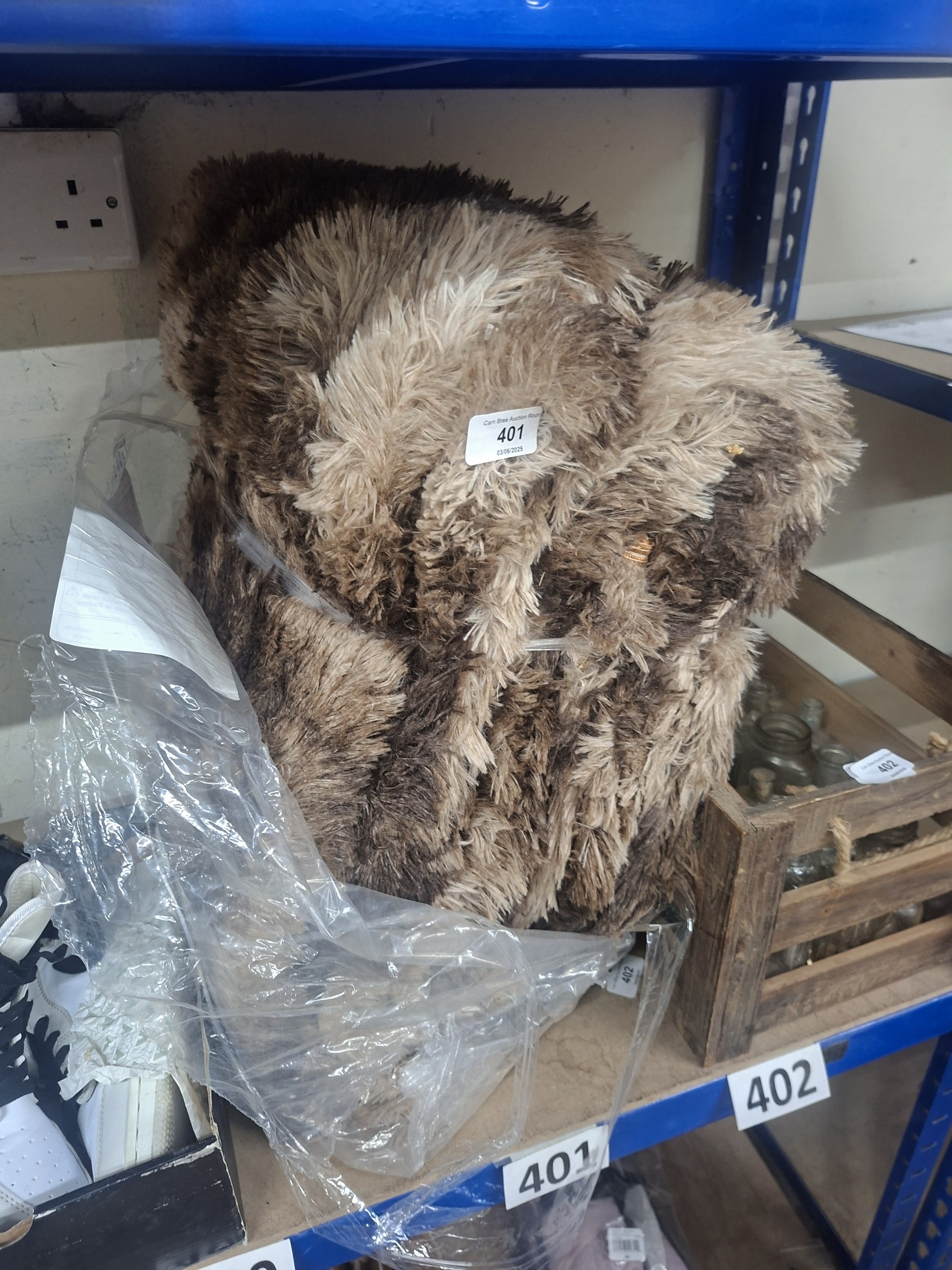A quantity of brown and beige long-pile faux fur fabric is loosely bagged.
