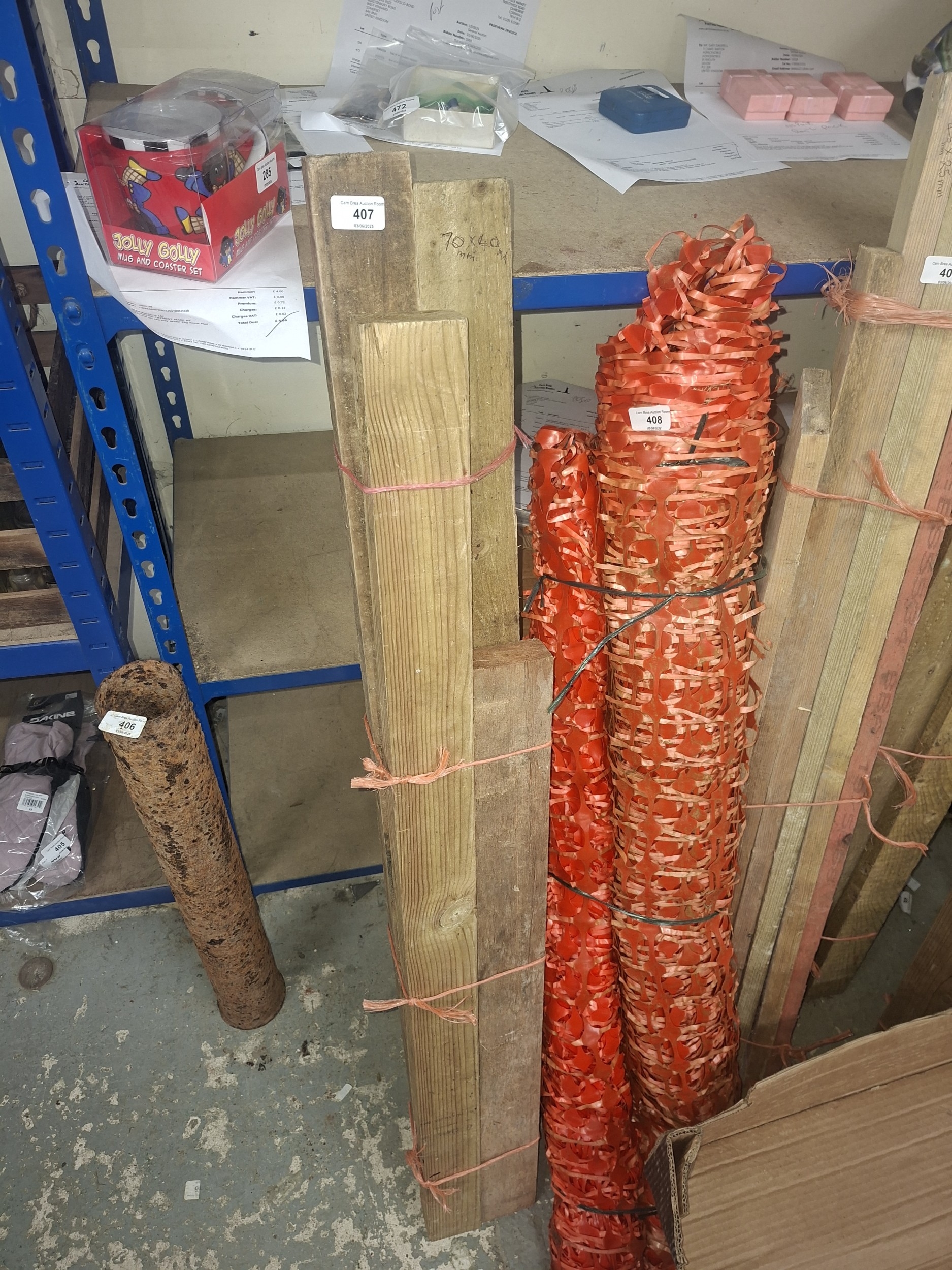 Lot includes two bundled wooden posts (70 x 40 cm) and a roll of orange netting.