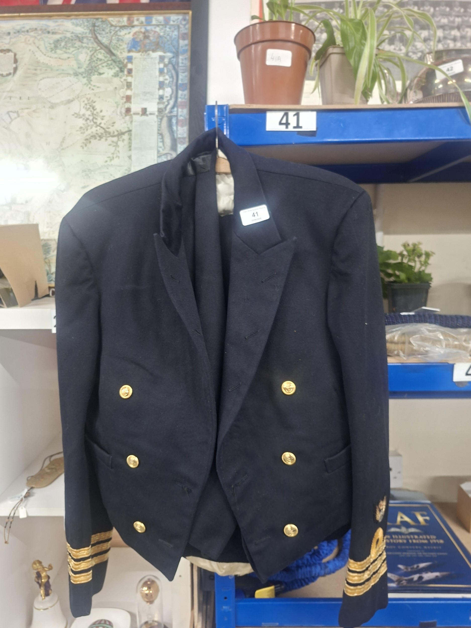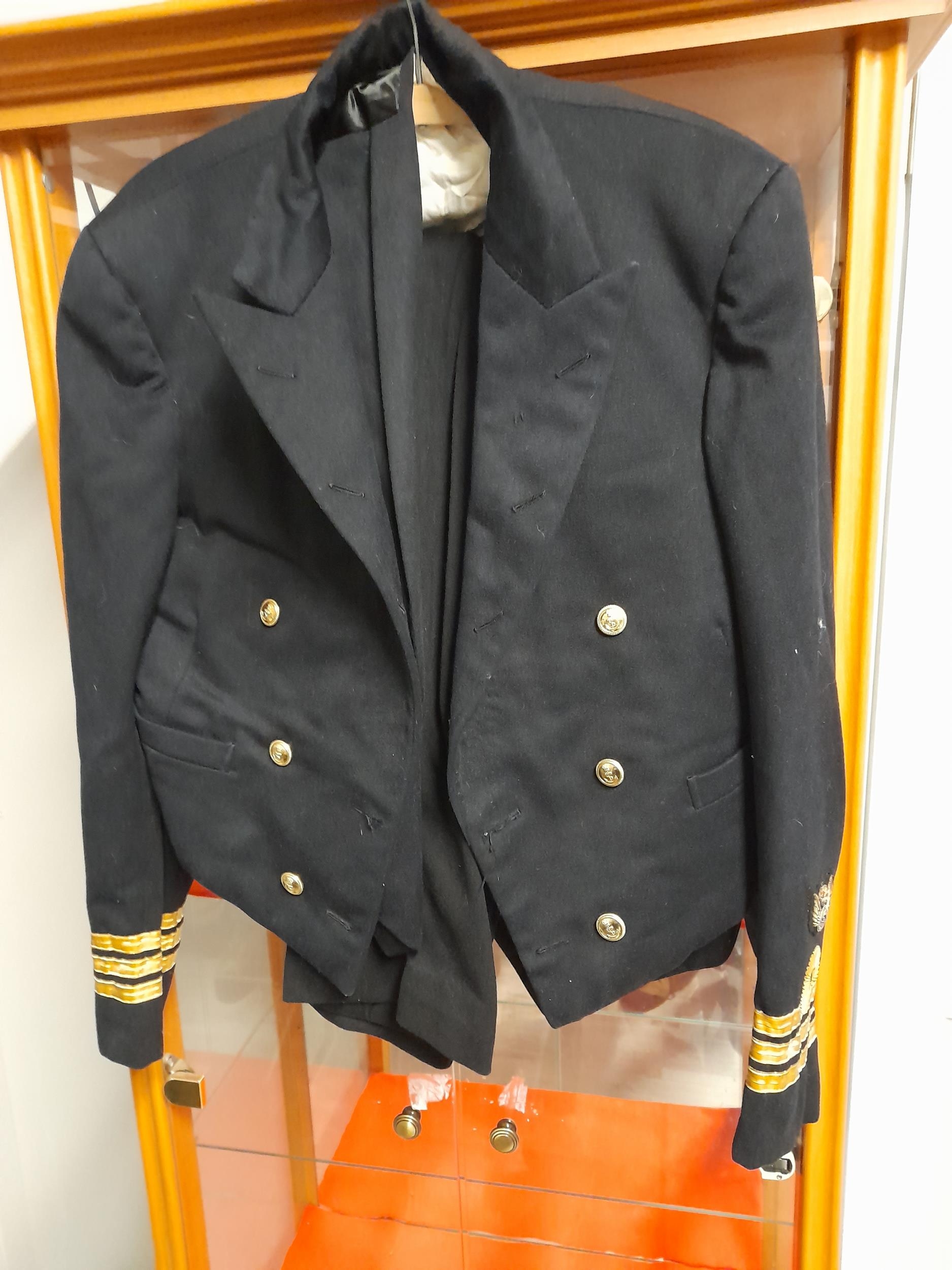 Navy blue double-breasted suit with gold braid detailing and minor creasing.
