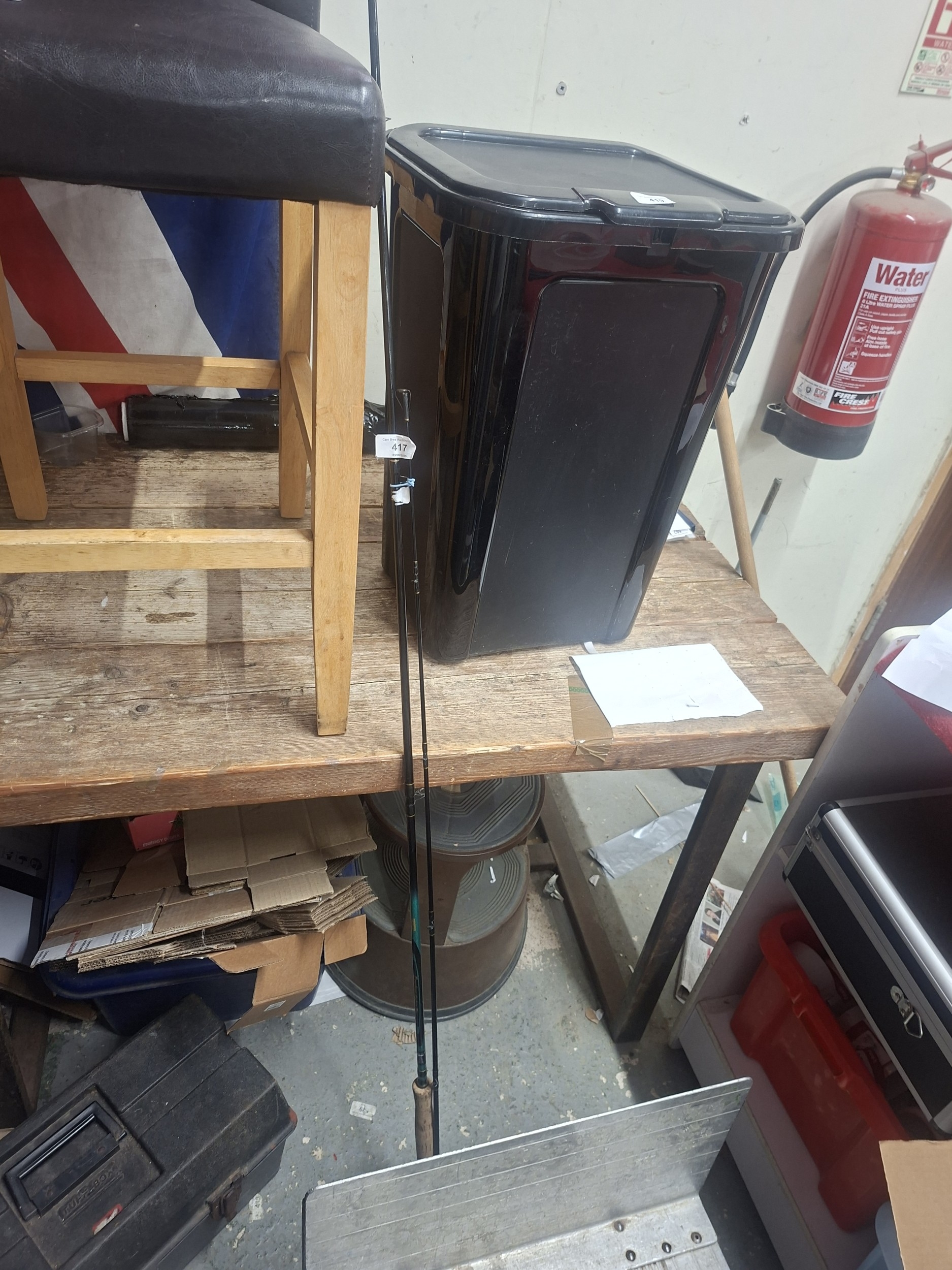 Two dark-colored fishing rods, one with teal accents, rest against a black plastic bin on a wooden table.