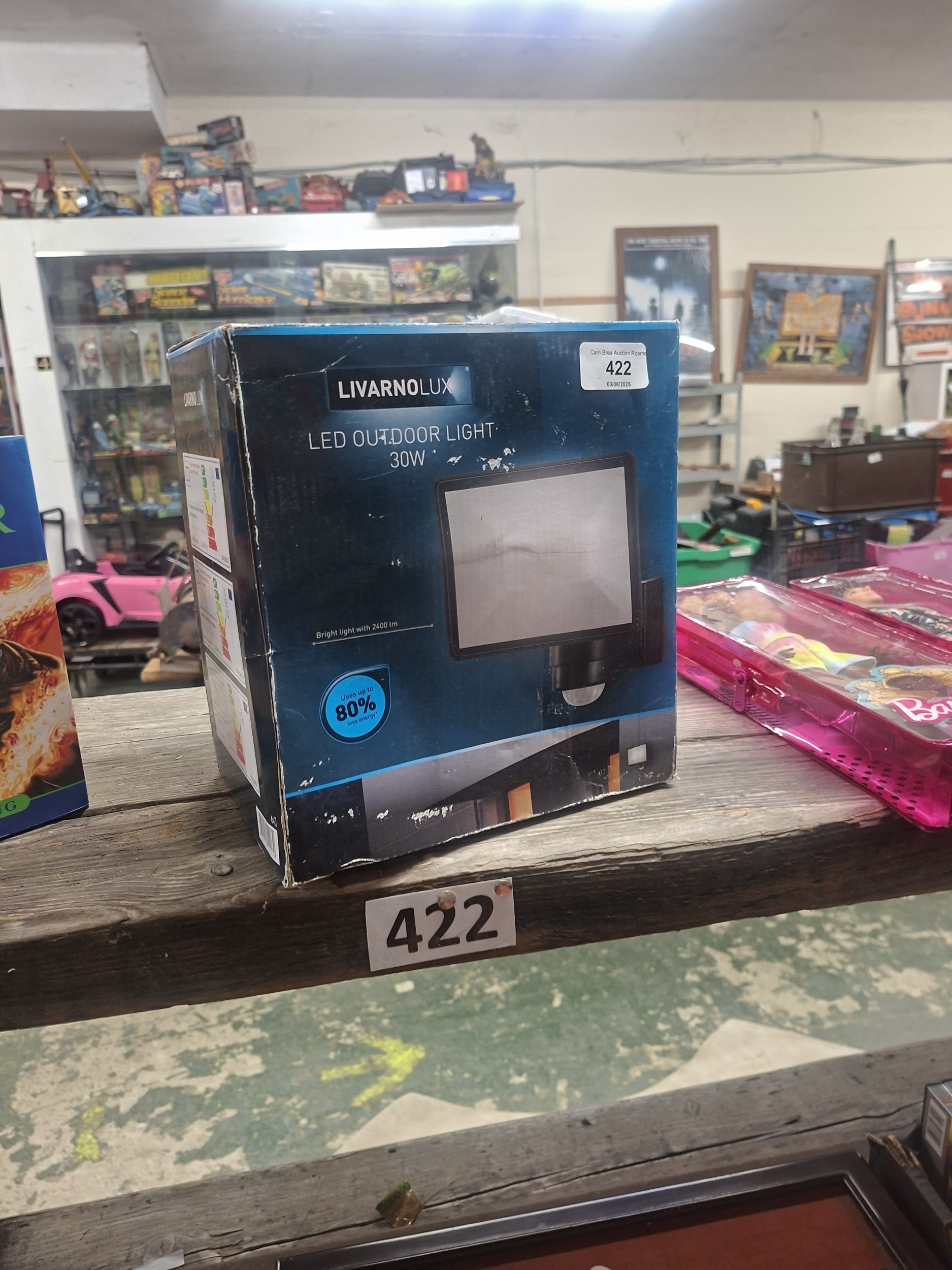 New in box LivarnoLux 30W LED outdoor light with 2400 lm brightness, showing minor box wear.