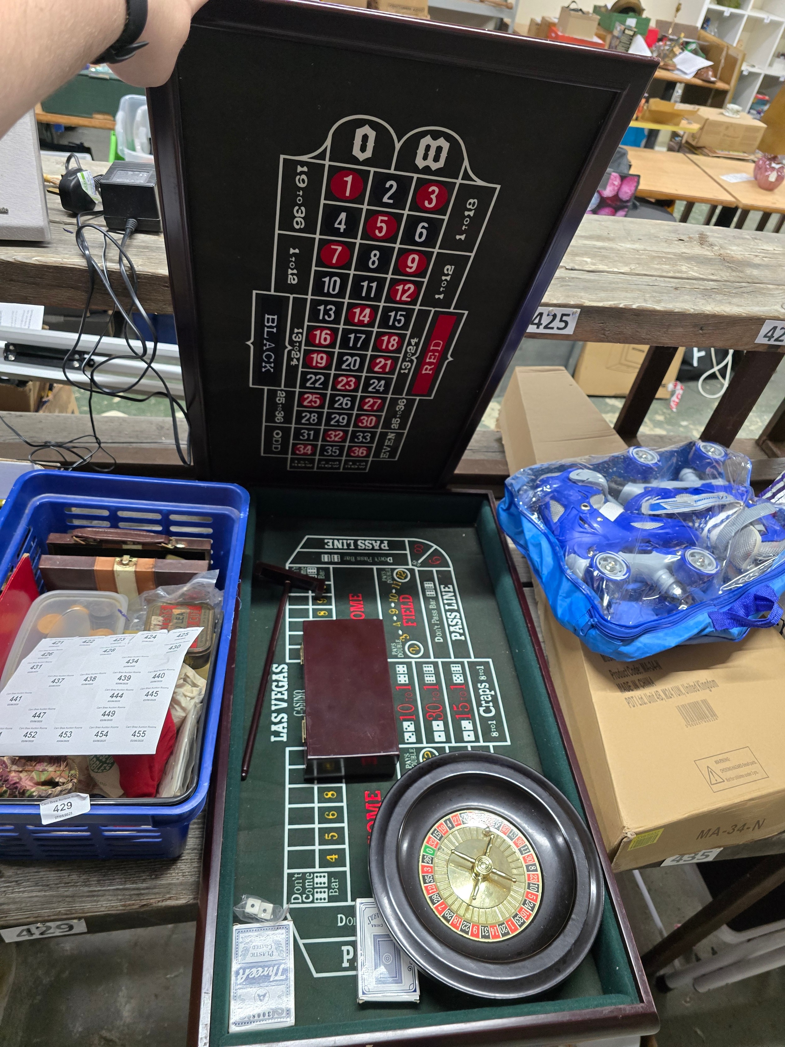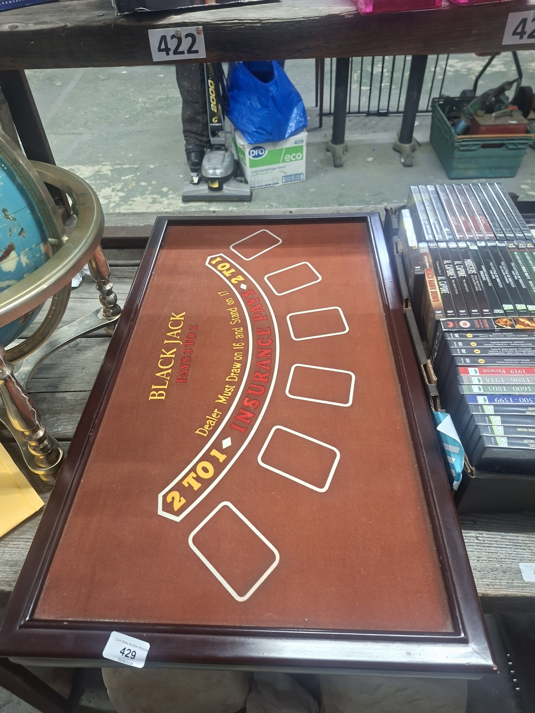 Dark wood-framed game board with felt playing surface for blackjack and roulette.