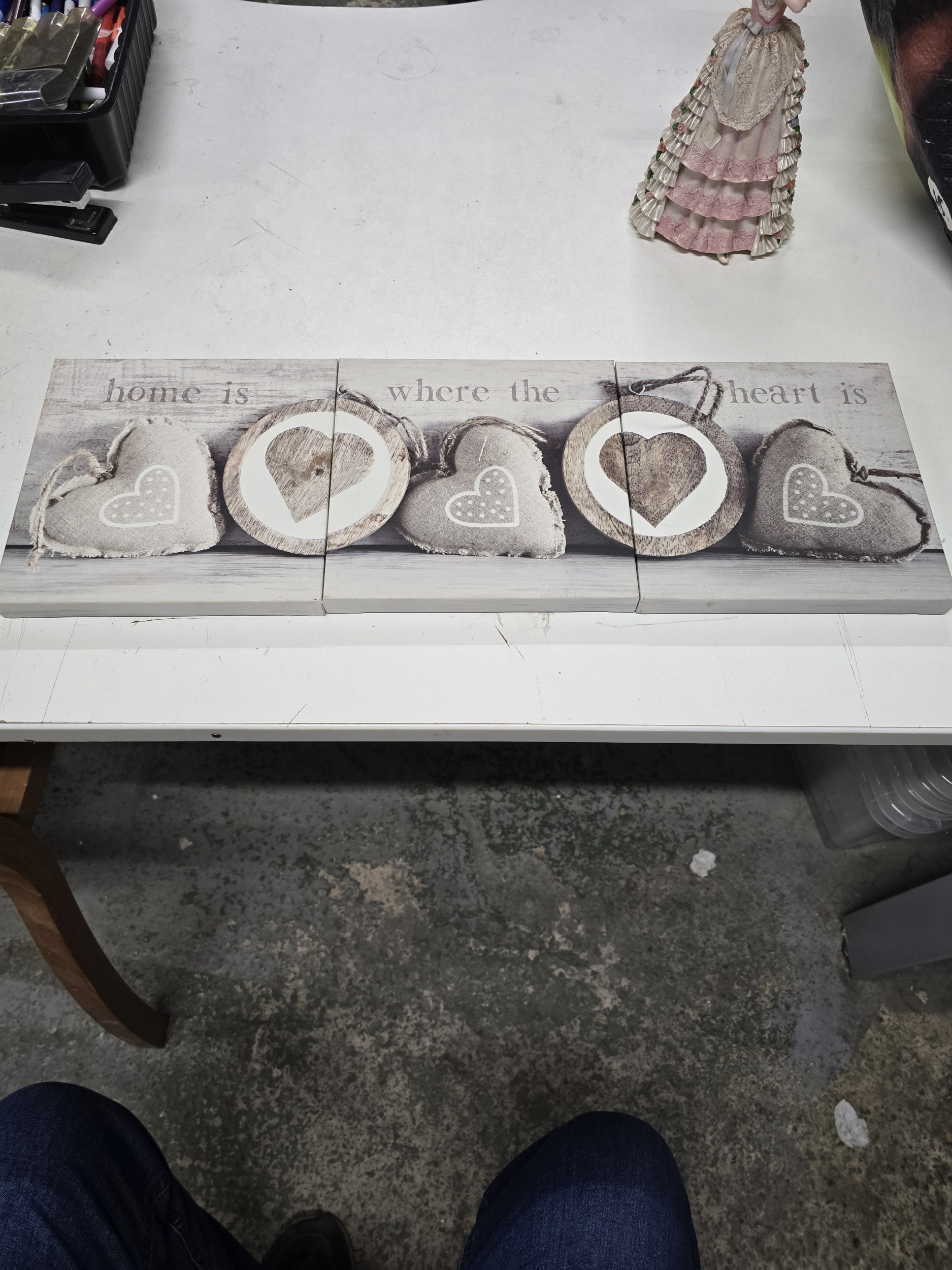 Three-panel canvas print depicting fabric hearts and wood-like textures with the phrase “home is where the heart is”.