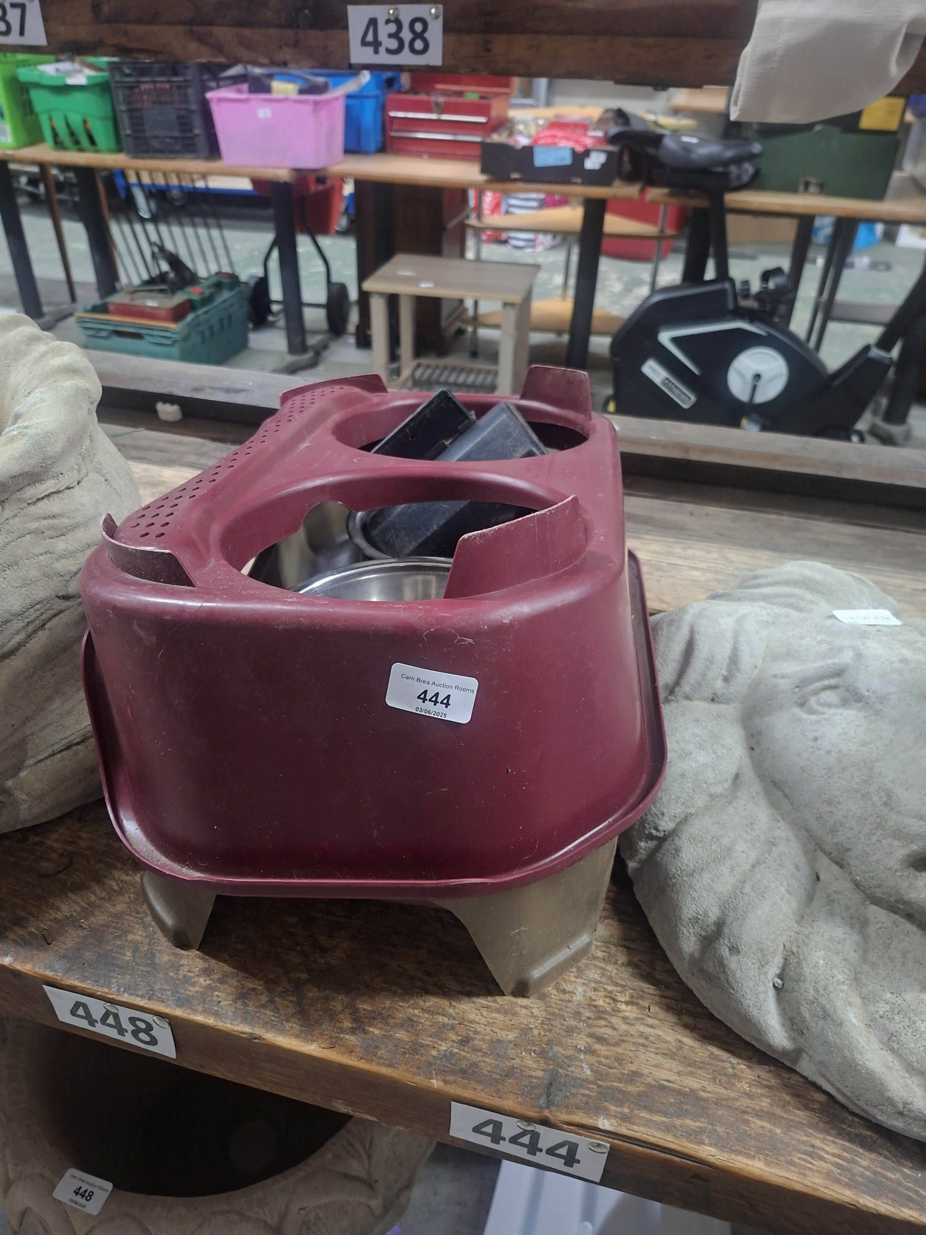 Maroon plastic pet food bowl stand with two stainless steel bowls, showing minor wear.