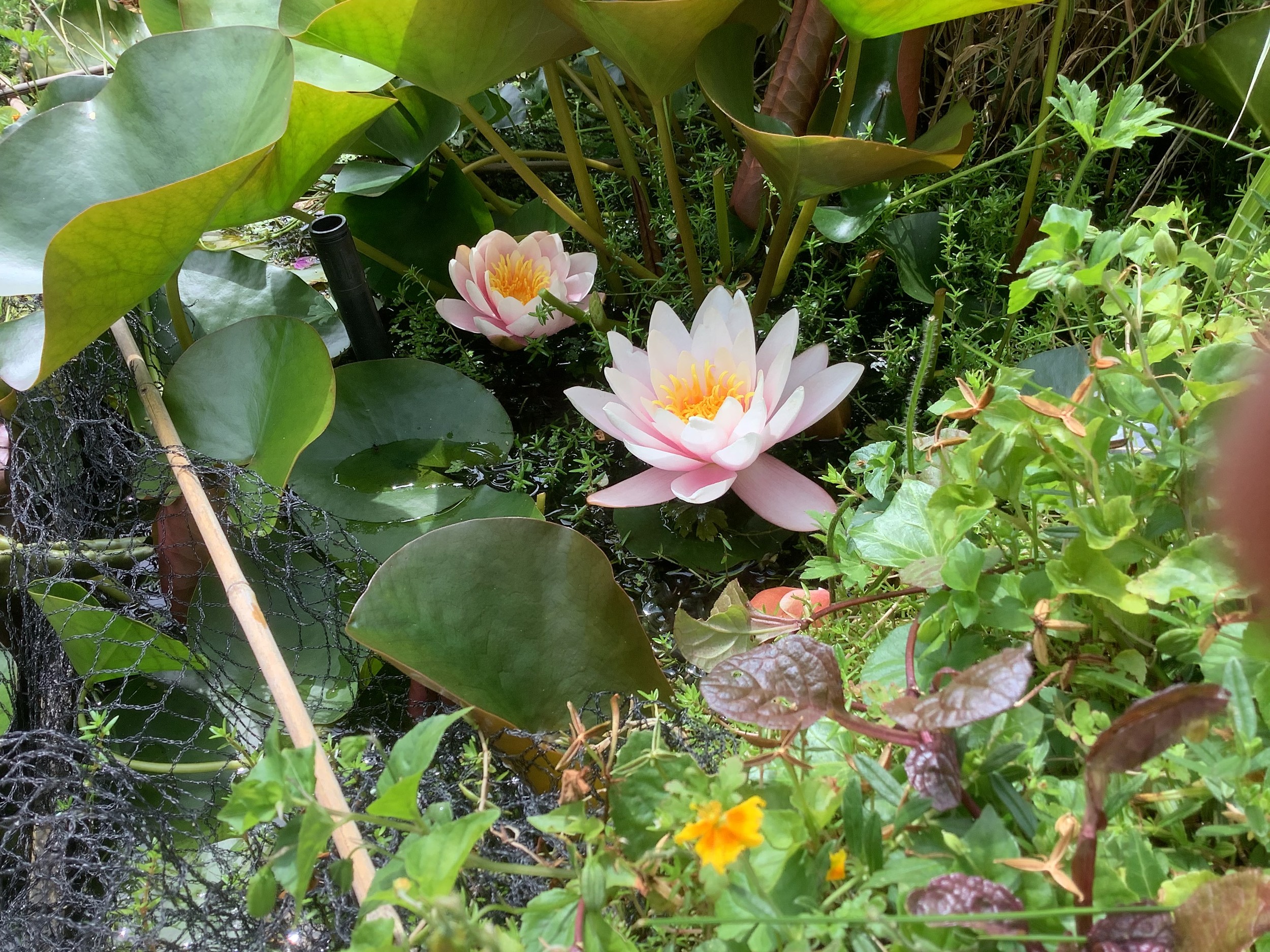 A healthy water lily plant in a clear plastic container with aquatic plants.
