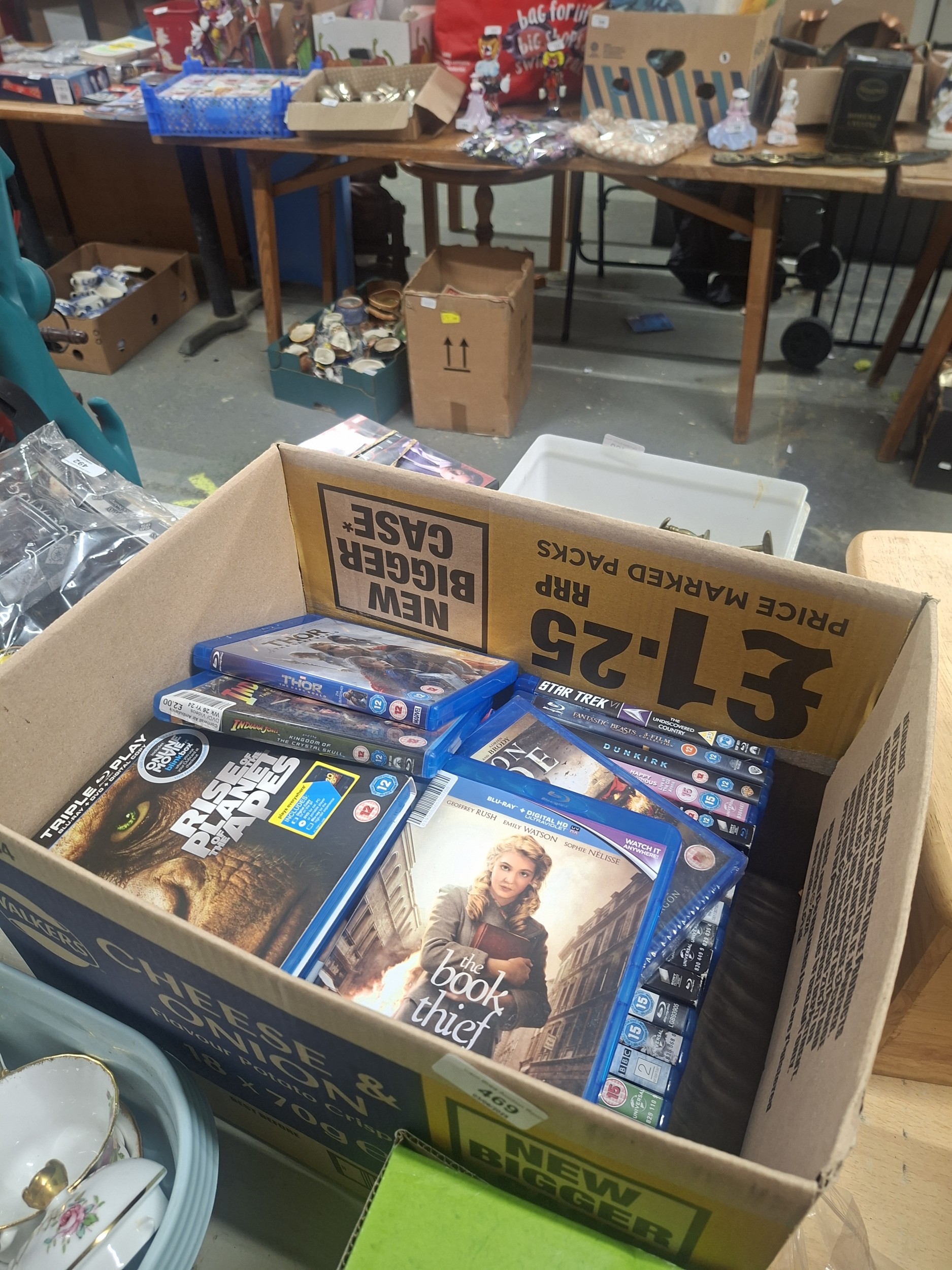 Used cardboard box containing various pre-owned Blu-ray discs, including titles such as “Rise of the Planet of the Apes” and “Indiana Jones.”