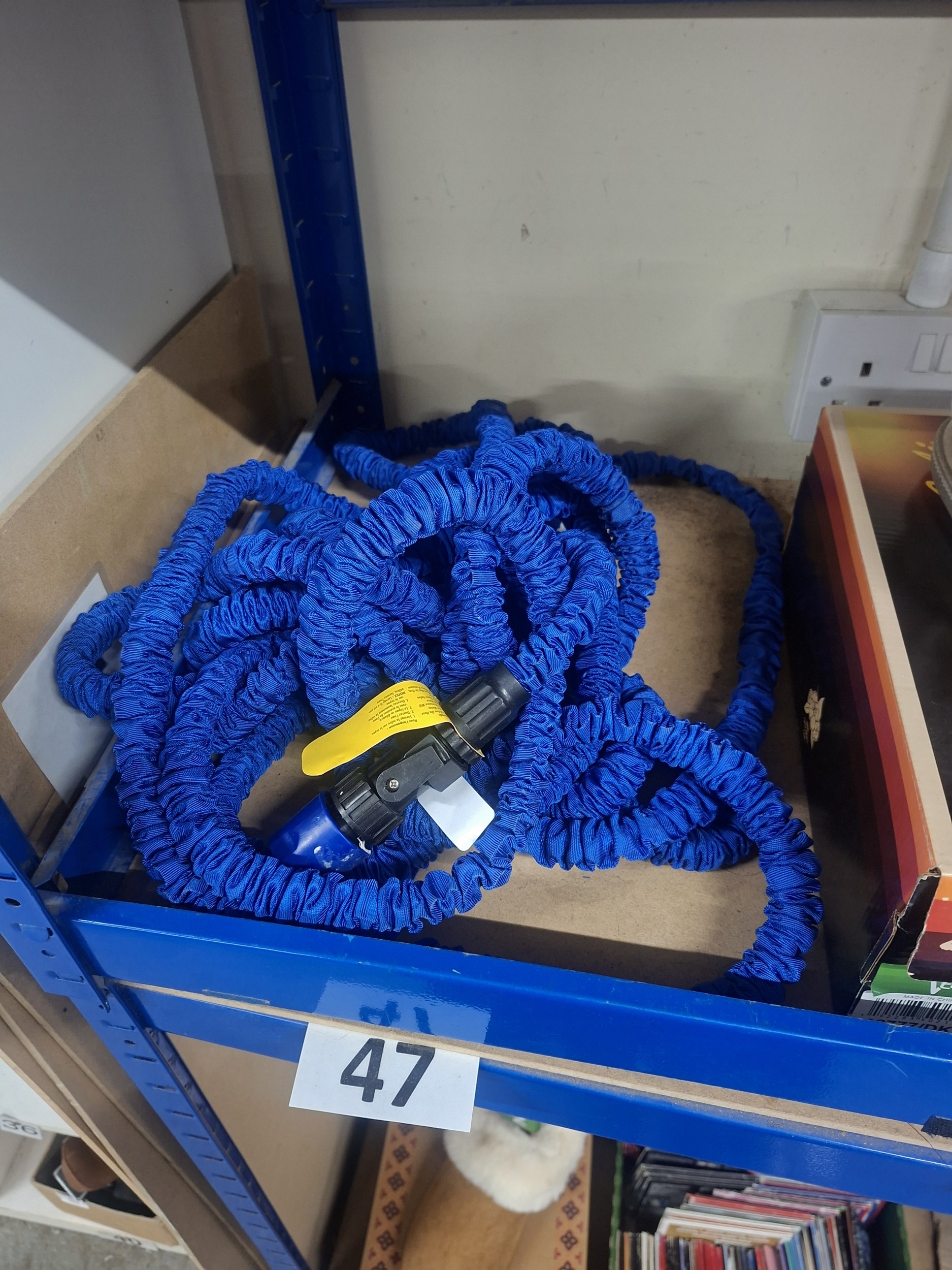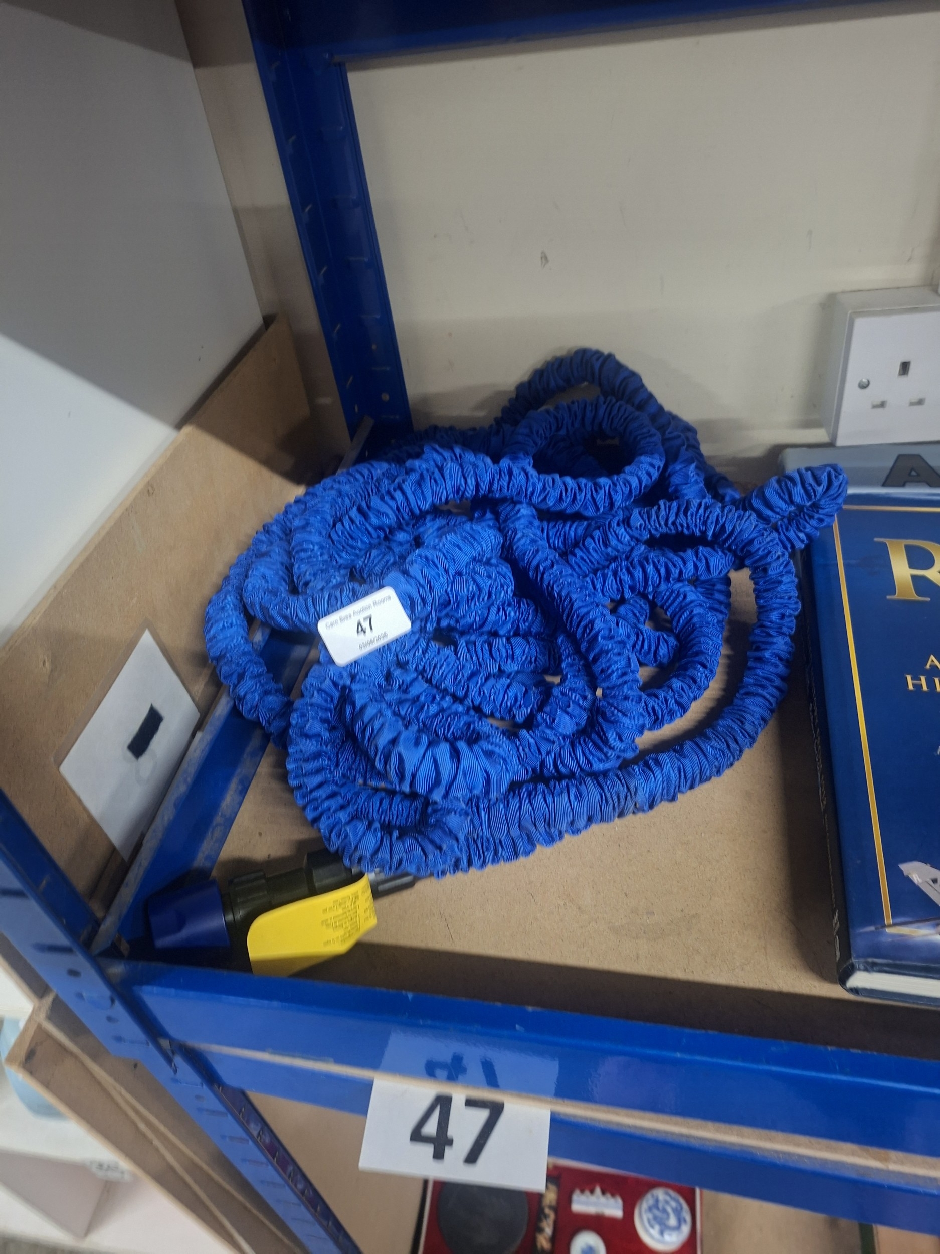 A coiled blue expandable garden hose with a black and blue connector and minor creasing.