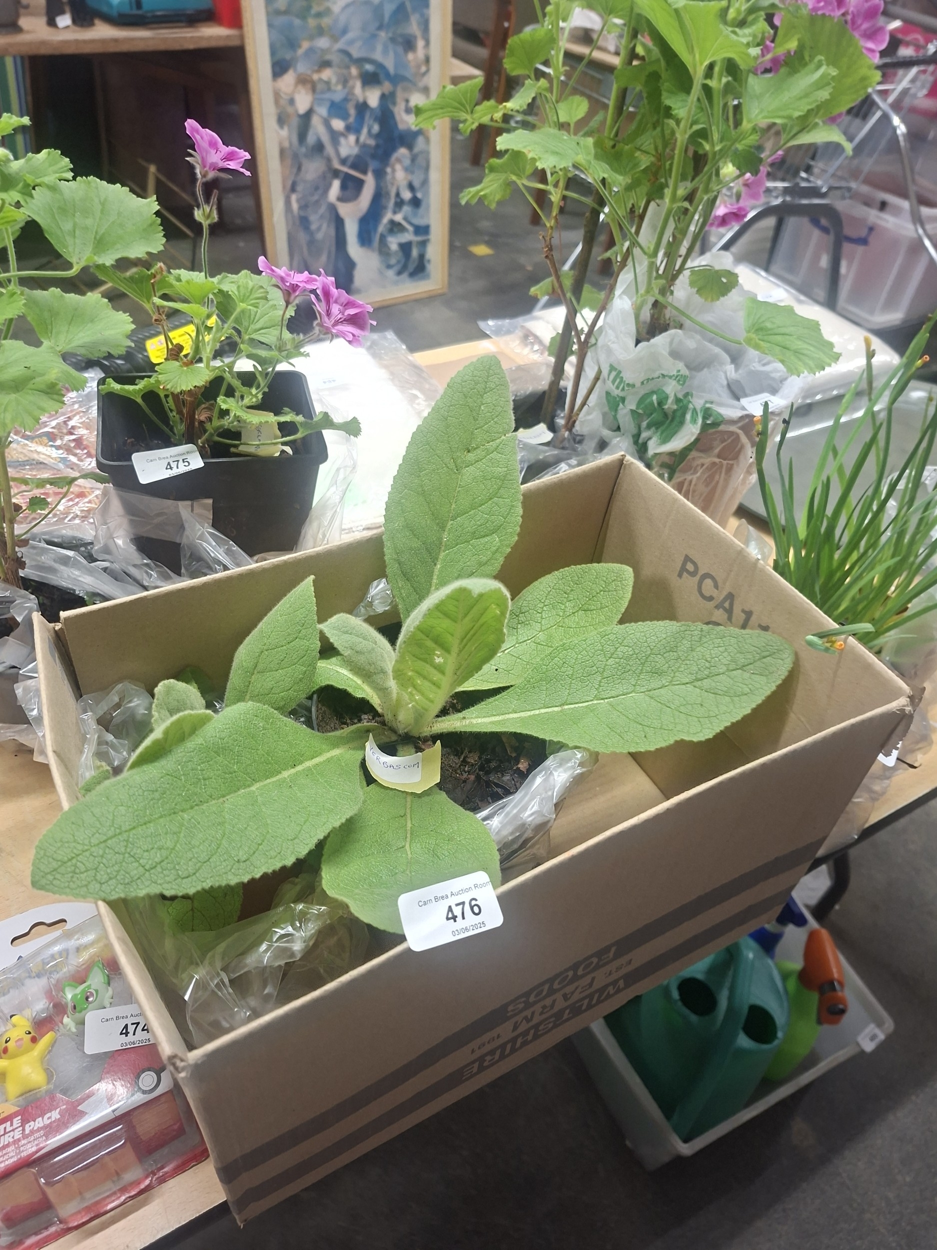A potted plant with large fuzzy leaves in a marked cardboard box, showing minor wear.