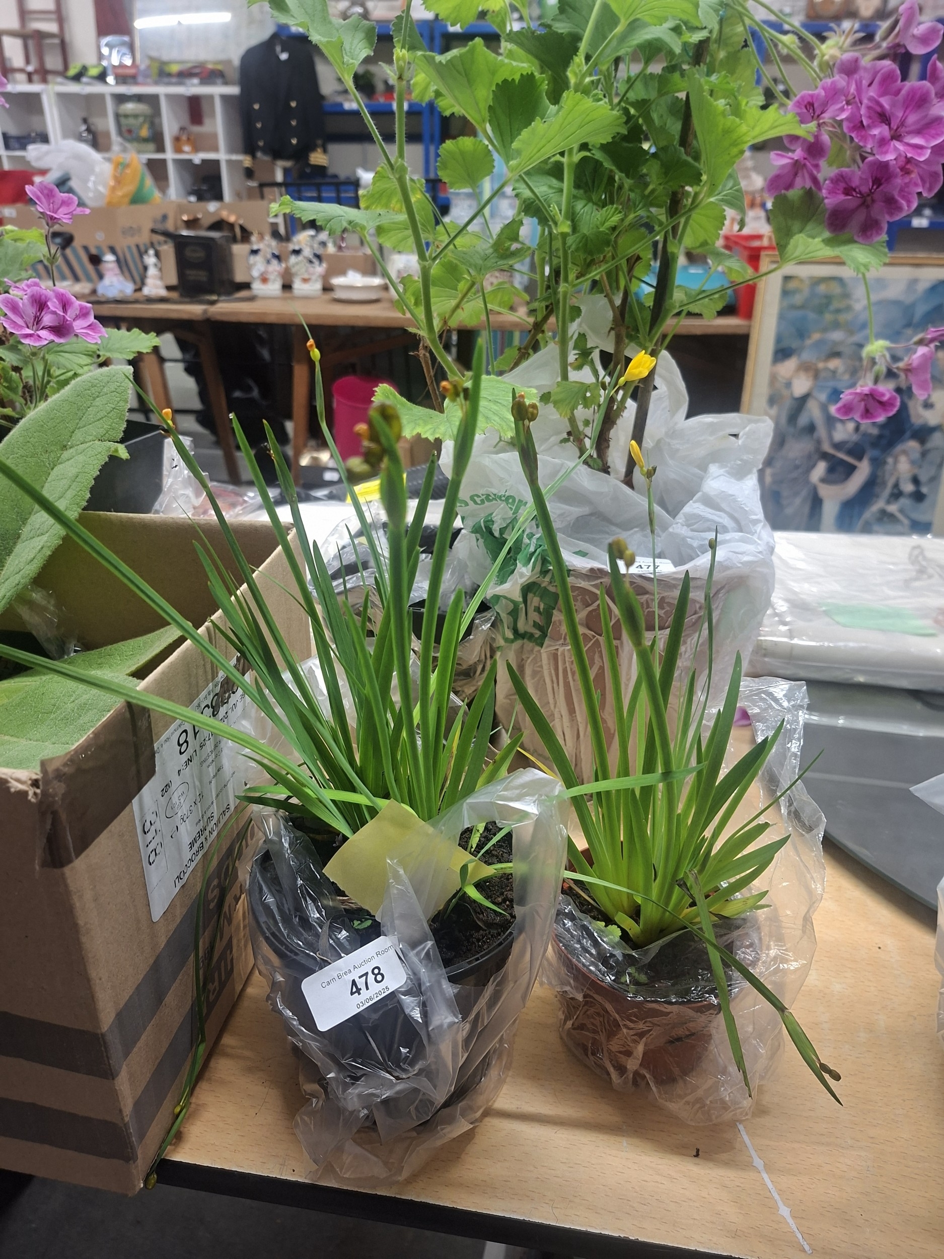 Two potted plants with long green leaves and unopened yellow flower buds, in plastic pots and bags.