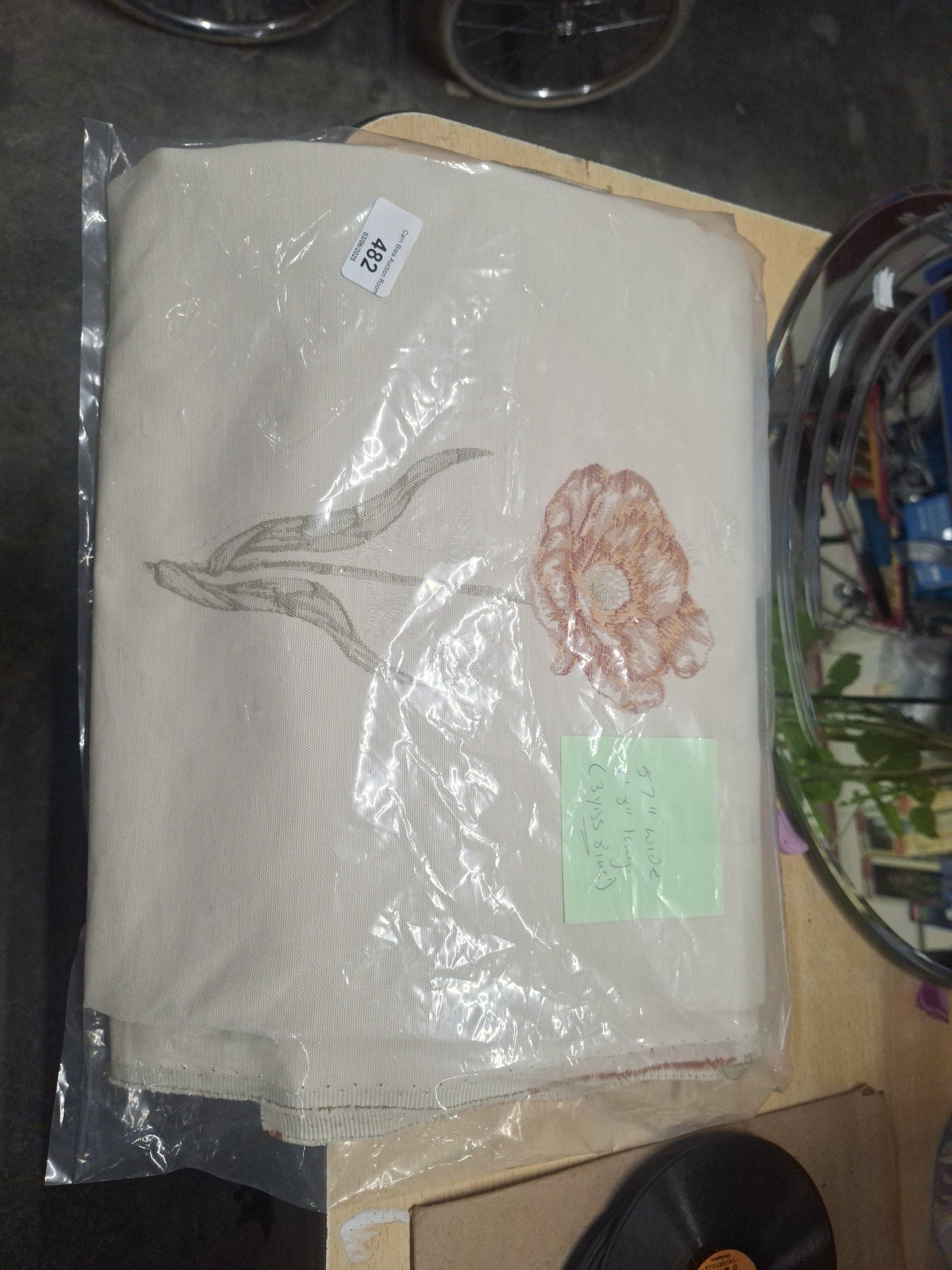 A rectangular piece of off-white fabric with an embroidered flower design, packaged in plastic.