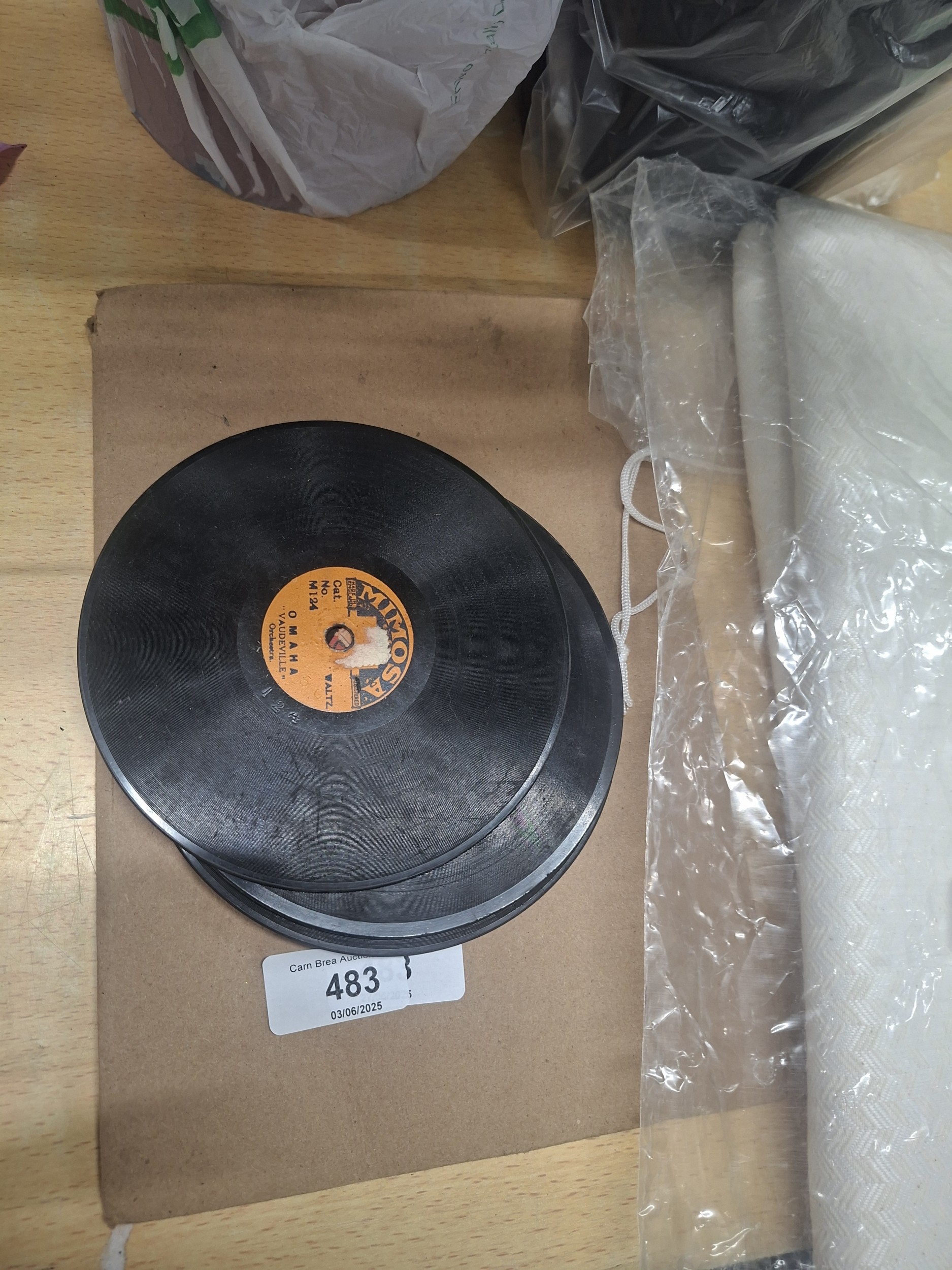 Three black shellac 78 rpm records with yellow/orange labels, showing minor surface dust, stacked on a notebook.