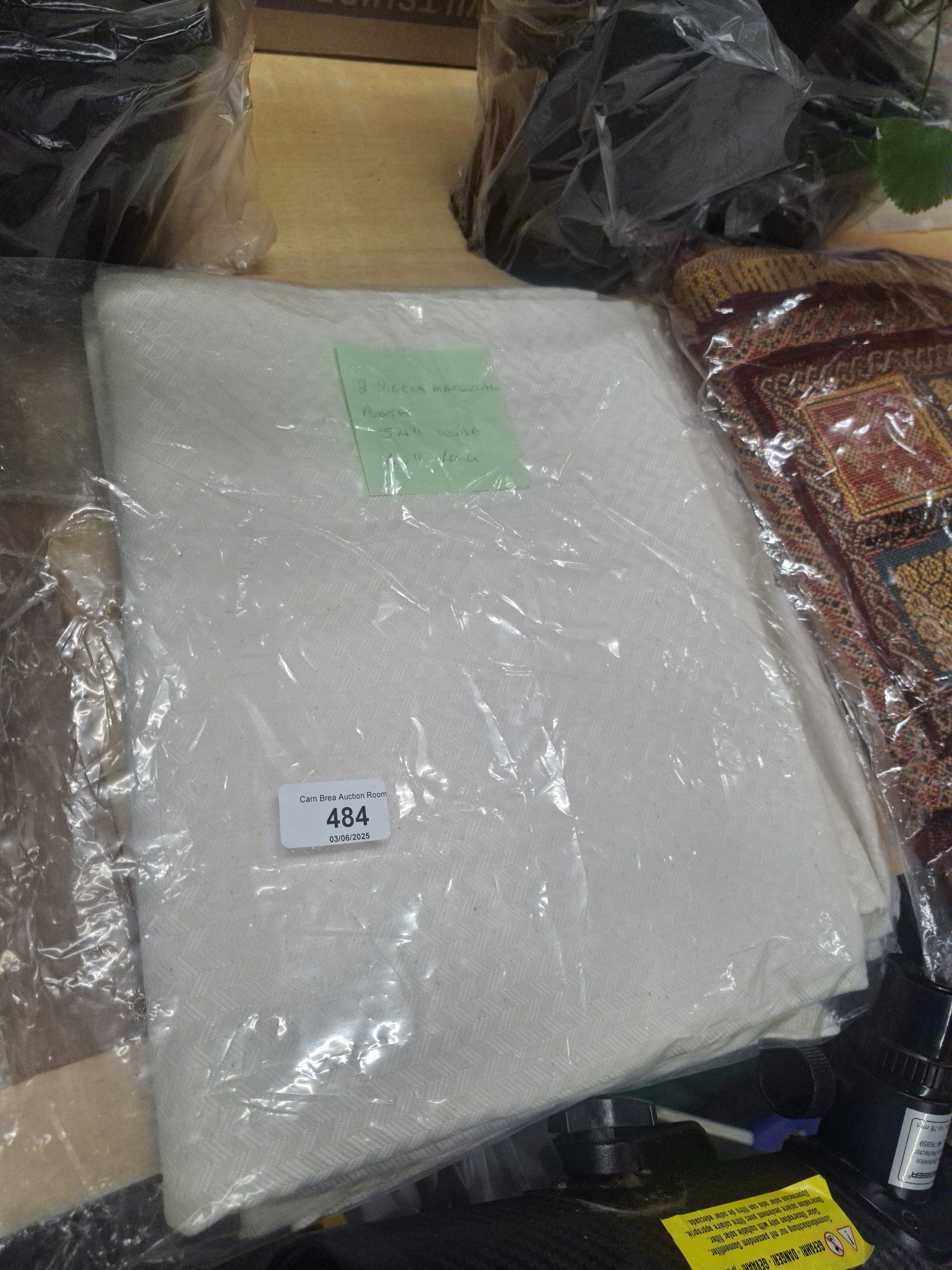 A roll of off-white fabric with a subtle herringbone pattern, wrapped in plastic.