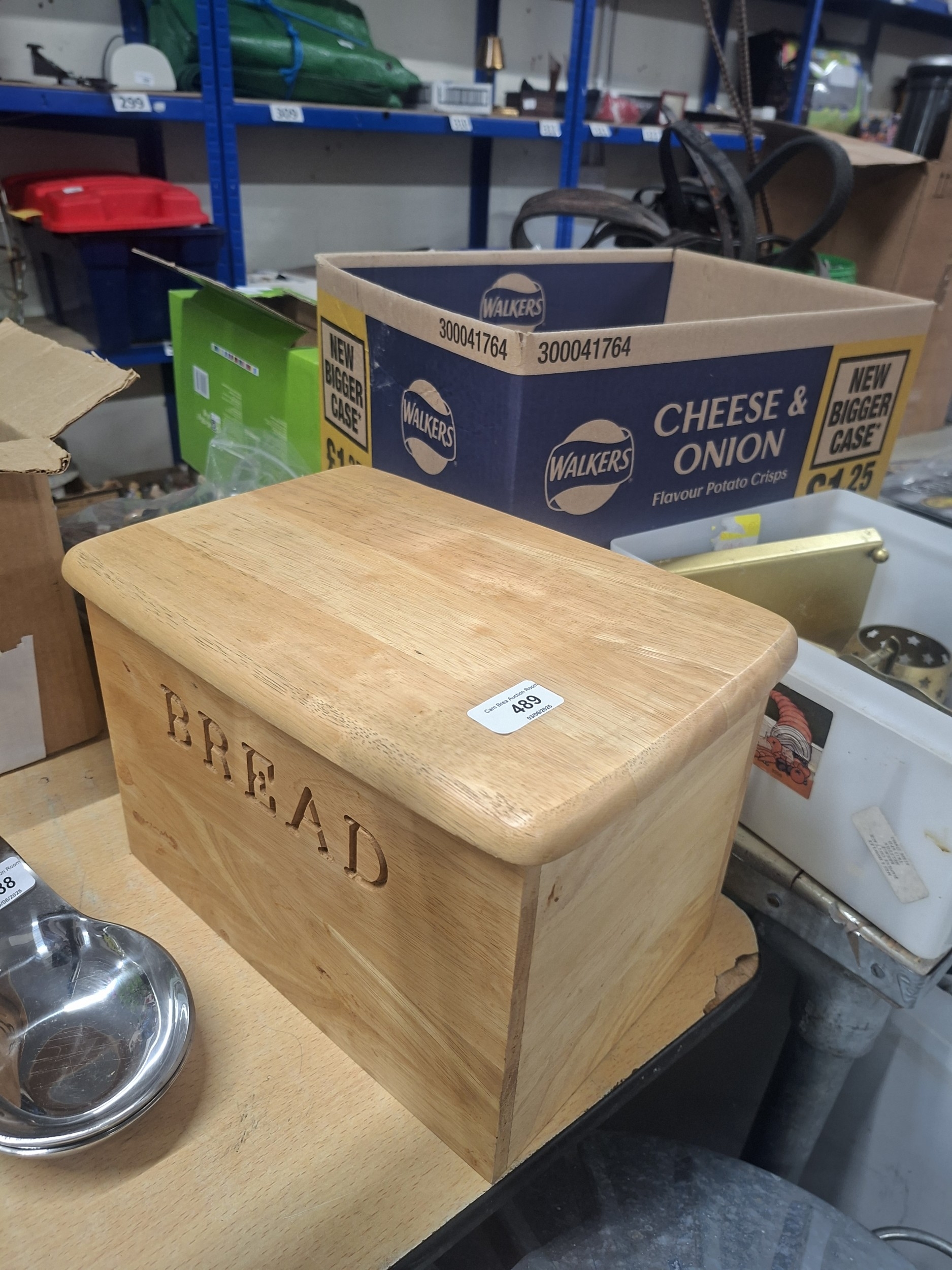 Rectangular light wood bread bin with hinged lid, minor wear.