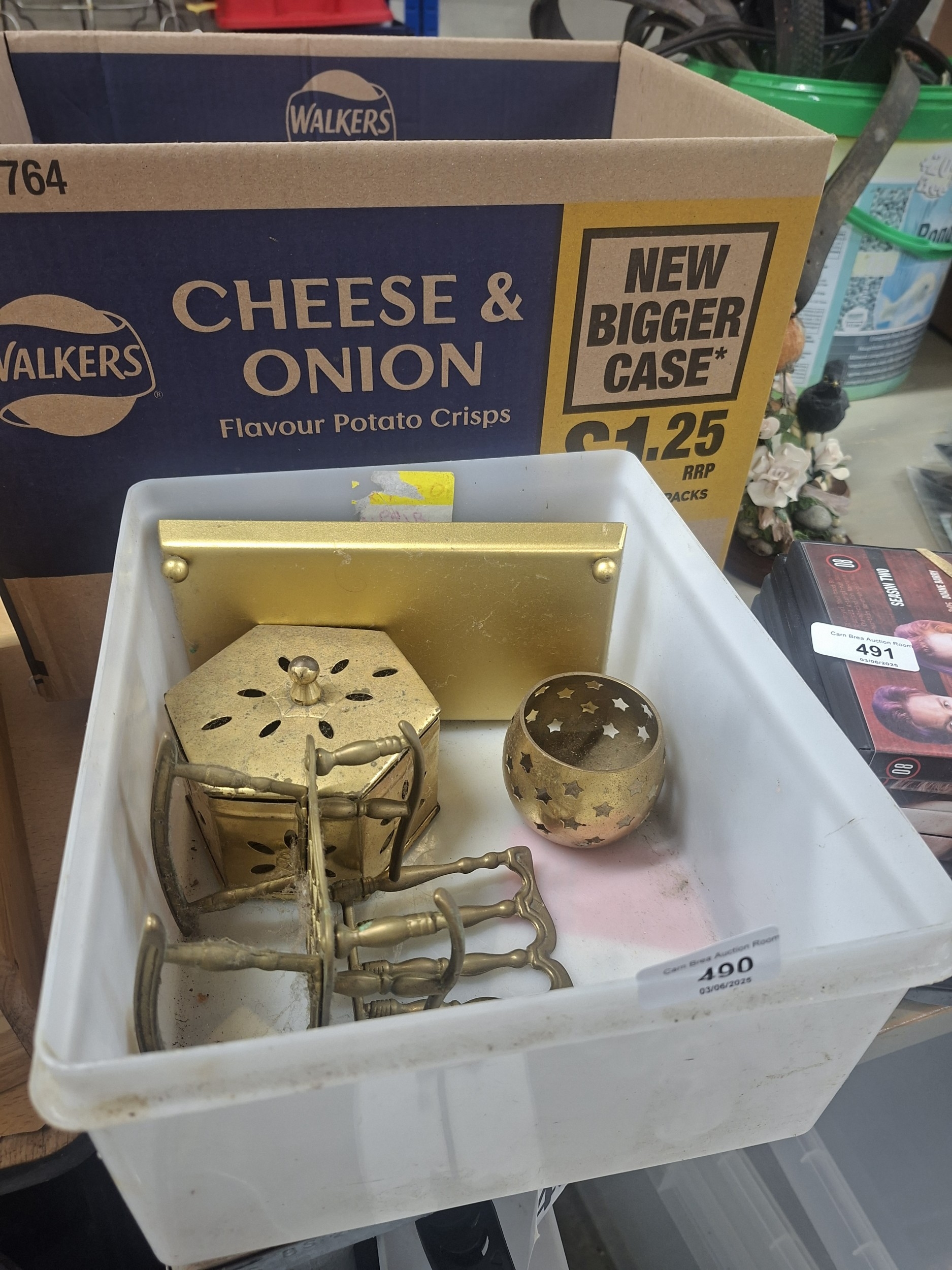 Four brass items—box, candle holder, coat rack, and plate—in a plastic container showing minor wear.