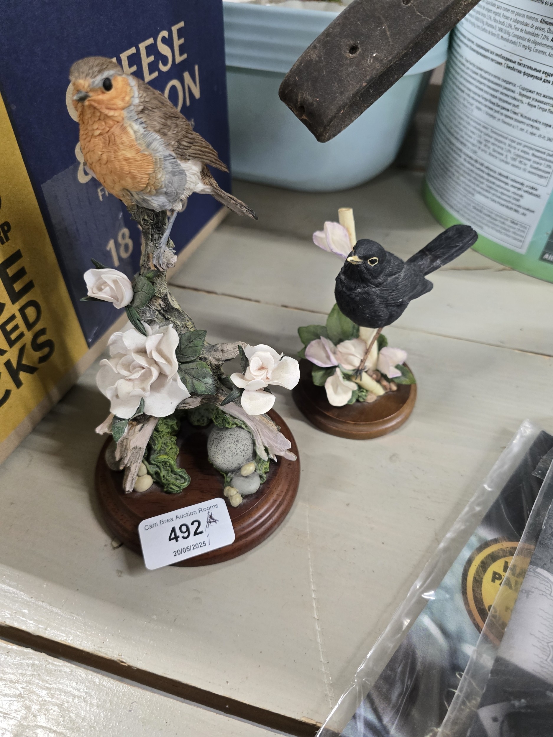 Two resin bird figurines, a robin and a blackbird, on separate dark brown wooden bases with sculpted branches and roses.