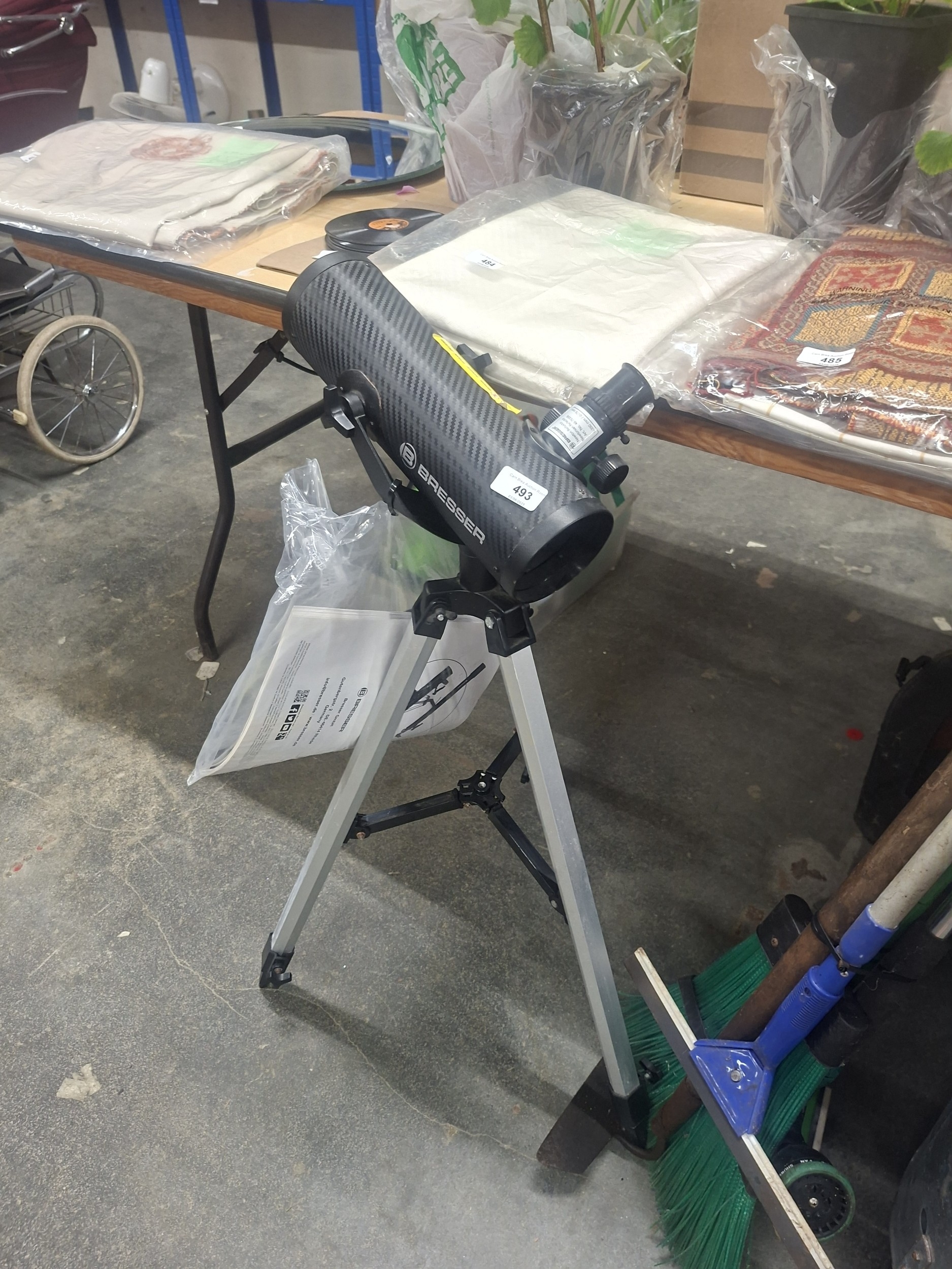 A black carbon fiber-patterned Bresser telescope on a silver tripod with instructions.