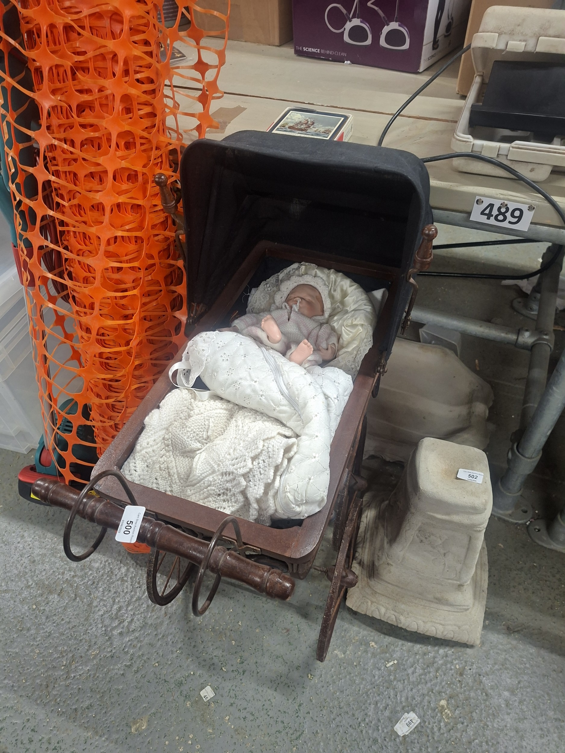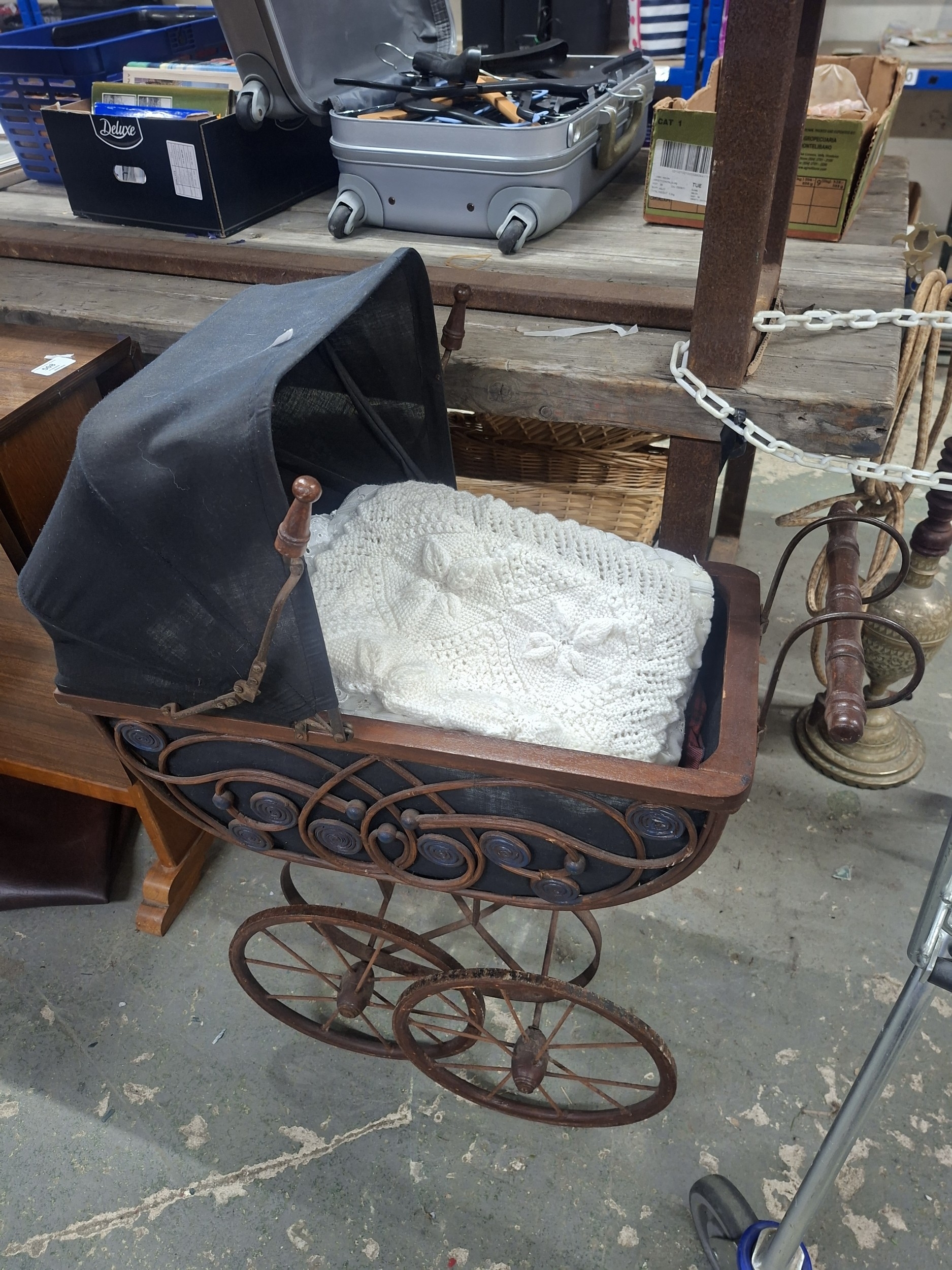 Dark wood doll pram with metal detailing, fabric canopy, and a doll, showing wear.